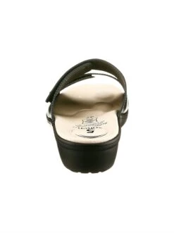 Mit weich gepolstertem 5-Zonen-Fußbett. Pantolette in Metallic-Optik. Obermaterial sowie Innenausstattung: Leder. 2 Klettverschlüsse. PU-Laufsohle, ca. 40 mm Keilabsatz. Weite G.