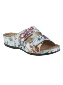 Pantolette mit 2 Klettverschlüssen am Rist. Obermaterial: Leder-Imitat. Futter: Textil. Besonders weiche, luftig perforierte Veloursleder-Innensohle. Laufsohle Synthetik. Absatz ca. 40 mm. Weite H.
