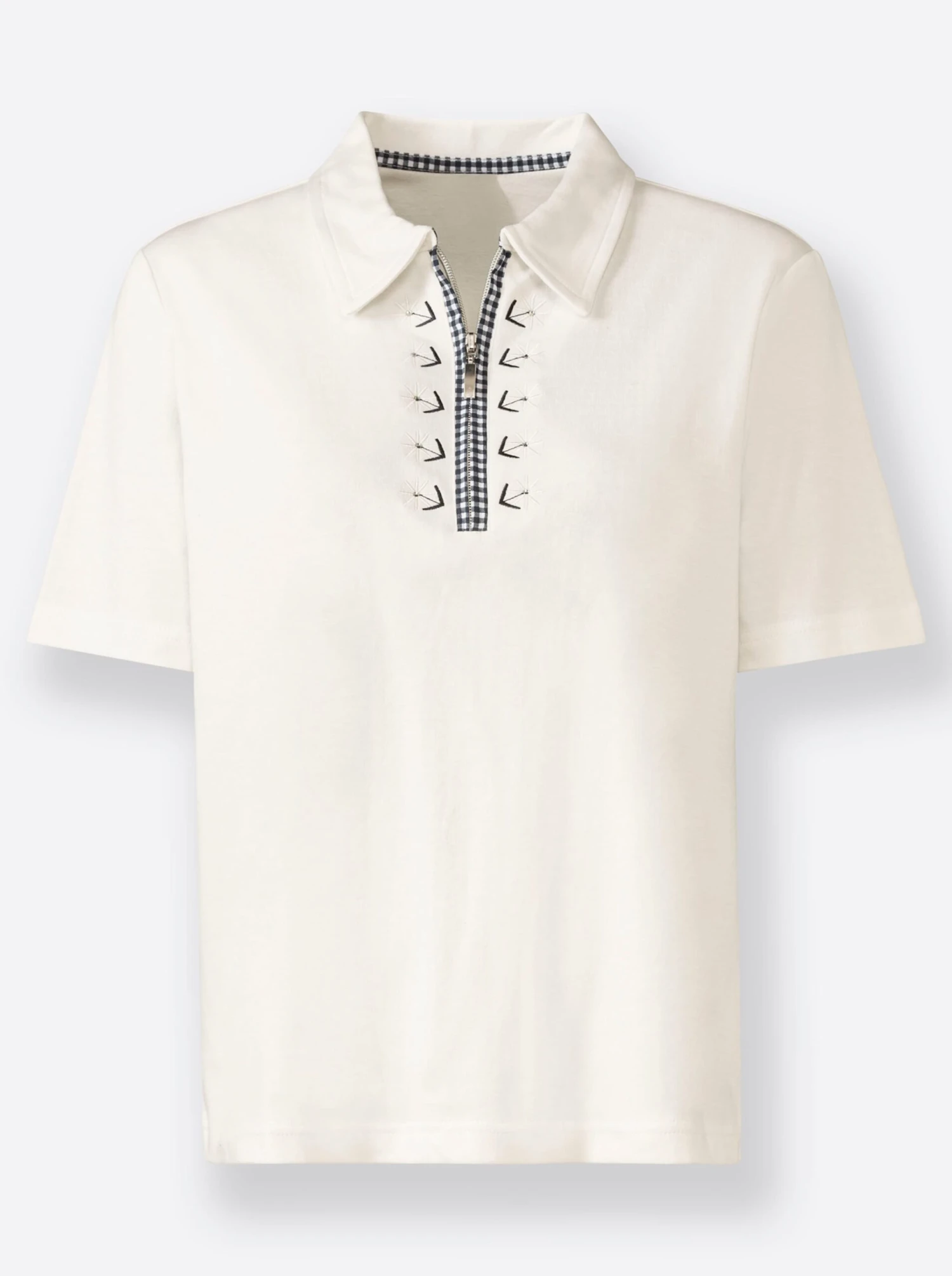 Poloshirt mit viel Liebe zum Detail: Kragen innen mit karierter Paspelierung. Gewebte Karopaspel und Stickerei mit Glitzersteinchen beidseitig entlang des Reißverschlusses. Etwas längerer Halbarm. Formstabile Interlock-Qualität.