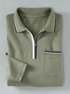 Gepflegtes Poloshirt mit zweifarbigen Streifen-Verzierungen am gerippten Kragen, am Reißverschluss und an der aufgesetzten Brusttasche. Lange Ärmel mit kontrastfarbigen Ziernähten. Seitenschlitze. Single-Jersey.
