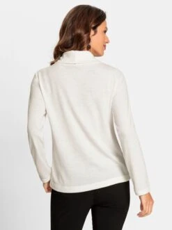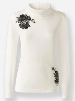 Ein attraktiver Kombi-Partner für elegante Looks. Pullover mit zauberhafter Blüten-Stickerei im Vorderteil. Leicht halsferner, wärmender Stehkragen und lange Ärmel mit Bündchen. In flauschig weicher Qualität.