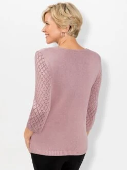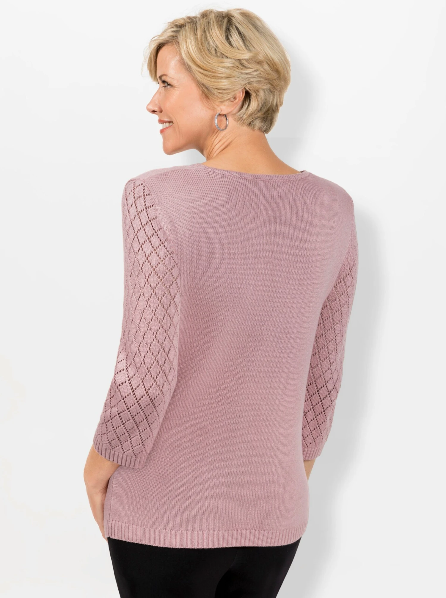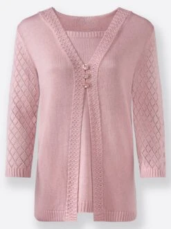 Im Ajourmuster: raffiniert gearbeiteter Pullover in 2-in-1-Optik. Jackenteil mit V-Ausschnitt, 3/4-Ärmeln und Schmuckknöpfen.
