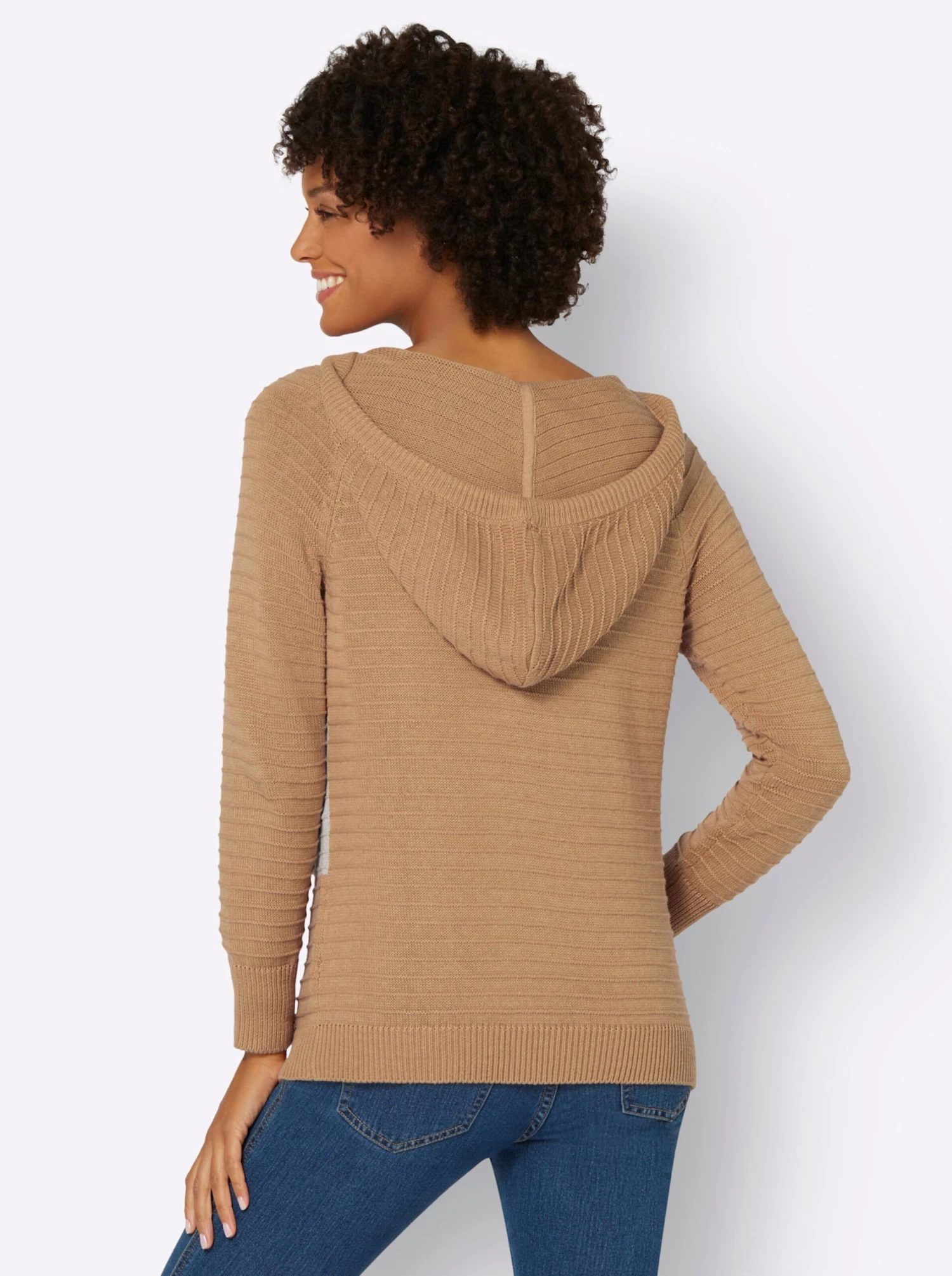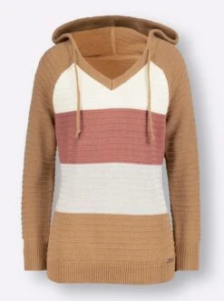 Effektvoll ist bei diesem trageangenehmen Pullover das Streifen-Strick-Muster in 3D-Optik vorne. Der Rücken bleibt einfarbig. Weitere Details: Kapuze mit Kordel zur Weitenregulierung und gerippte Abschlüsse an V-Ausschnitt, den langen Raglanärmeln und Saum. Mit dem Kauf unterstützen Sie die Initiative Cotton made in Africa.
