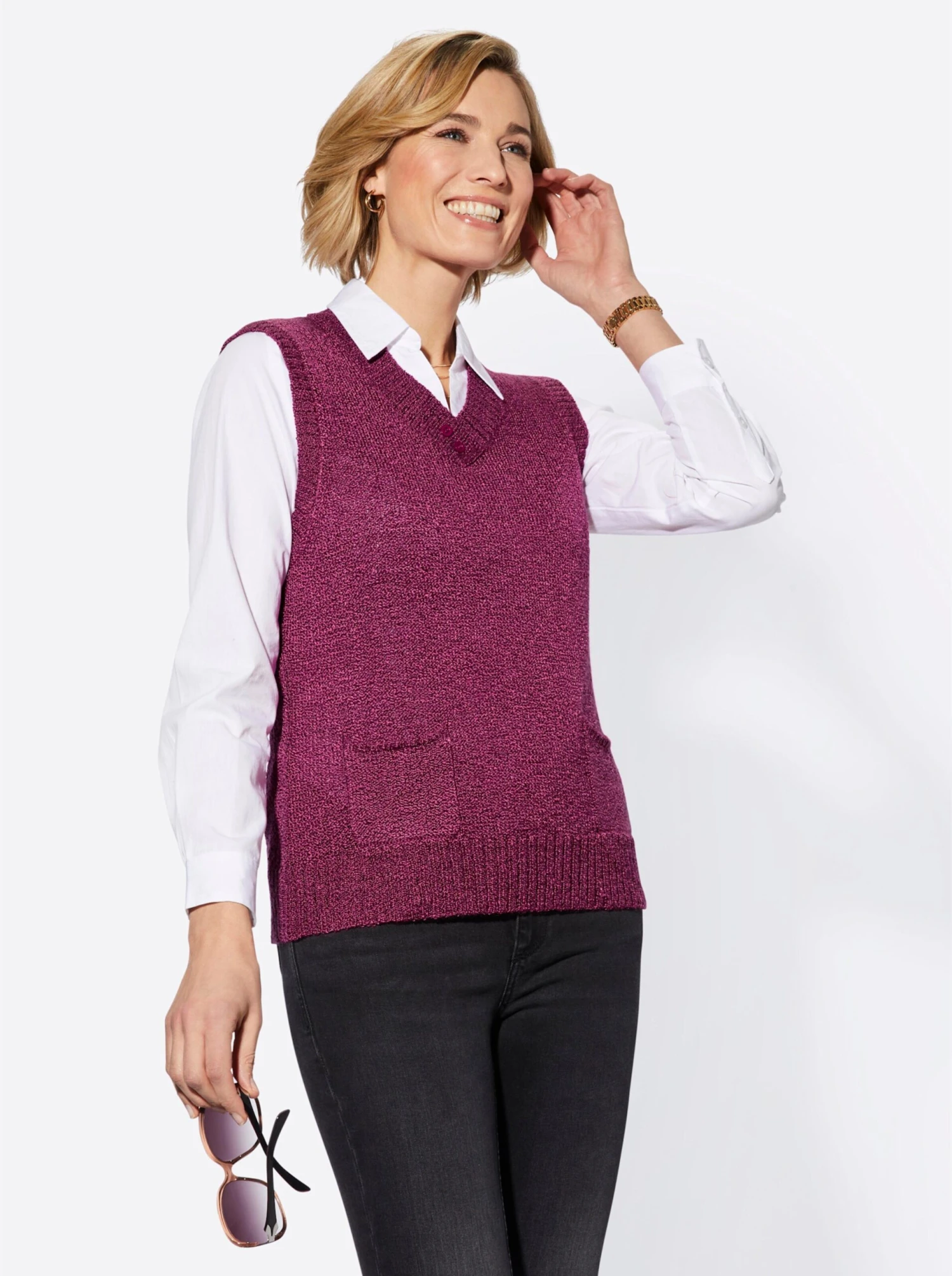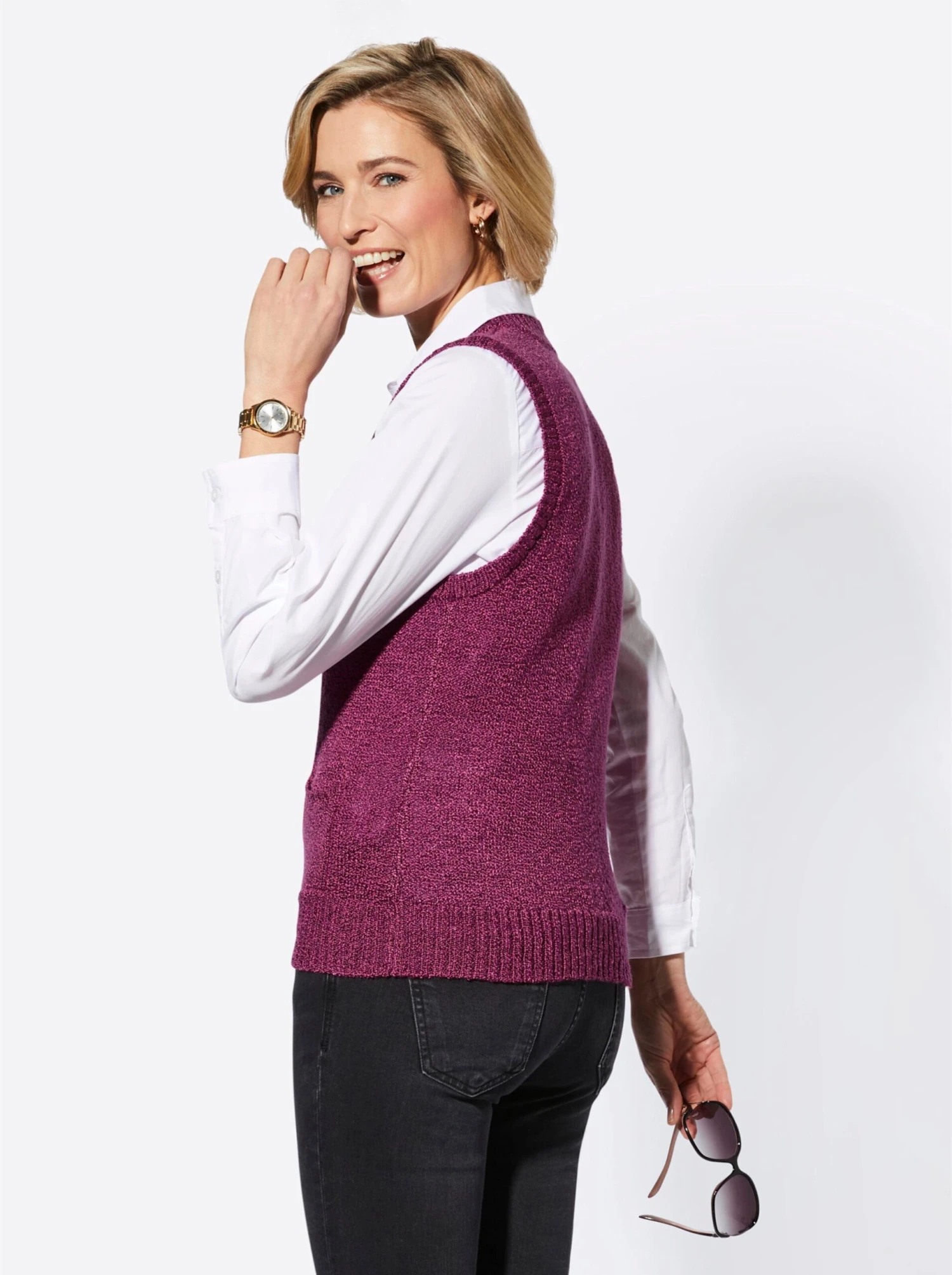 Kombistarker Pullunder in weicher Bouclé-Qualität und ansprechender Melange-Optik. Vorteilhaft streckender V-Ausschnitt mit 2 Zierknöpfen. Aufgesetzte Taschen. Sorgfältig in Form gestrickt, mit gerippten Abschlüssen.