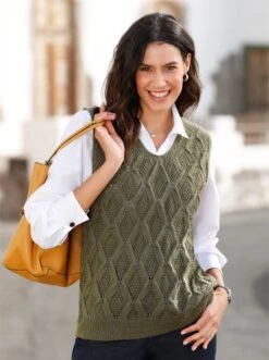 Wunderbar weich und flauschig die Qualität, effektvoll das Strickmuster mit Ajour-Details rundum – so begeistert dieser kombifreundliche Pullunder. Mit optisch streckendem V-Ausschnitt und geripptem Bündchen am Saum. Hochwertig passformgerecht gestrickt.