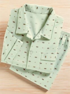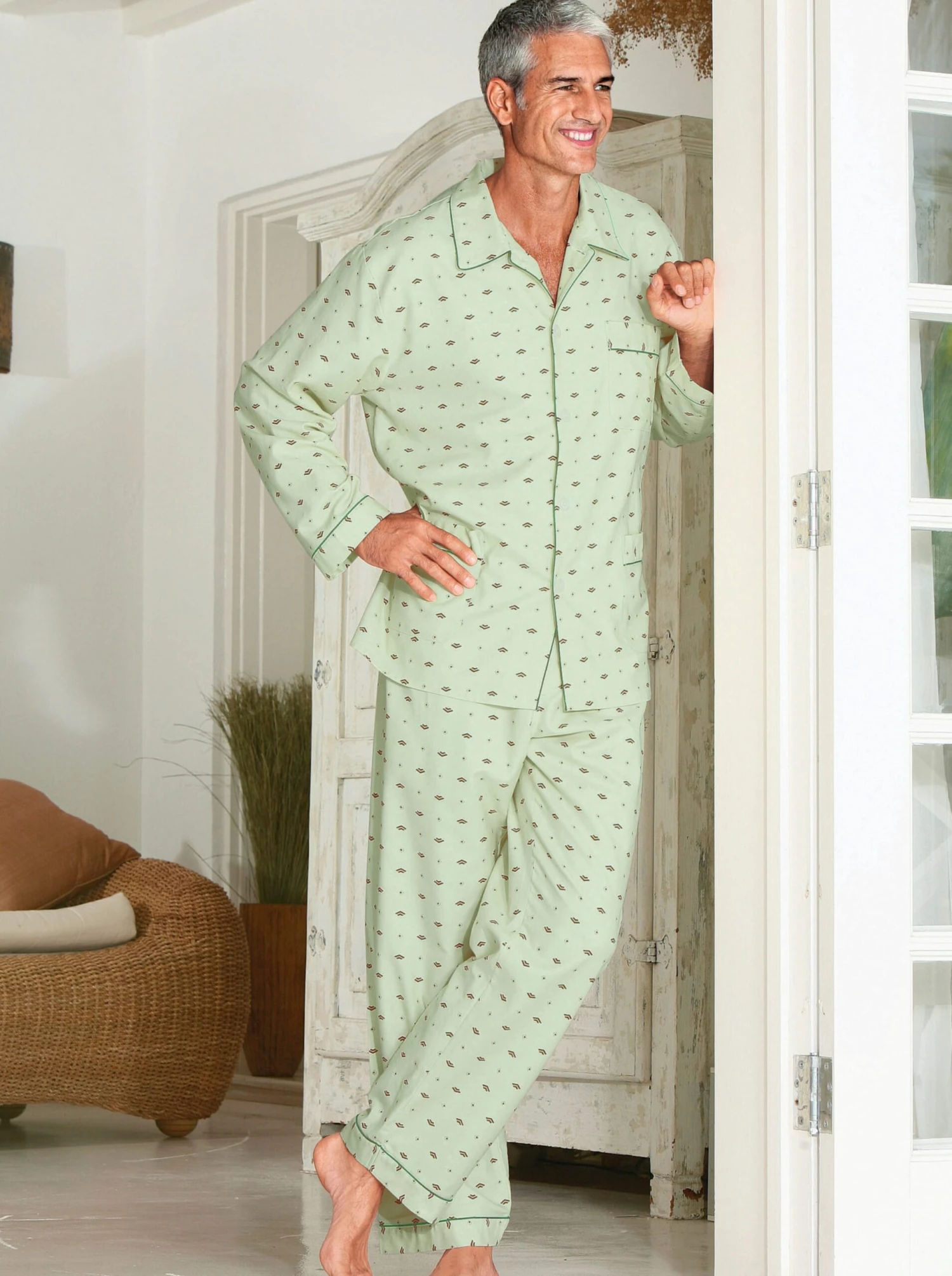 Pyjama mit kontrastfarbener Paspelierung an den Abschlüssen. Reverskragen, durchgehende Knopfleiste, Brusttasche, 2 aufgesetzte Taschen. Hose mit geknöpftem Schlitz und Dehnbund. Wärmende, innen leicht angeraute Finette-Qualität.