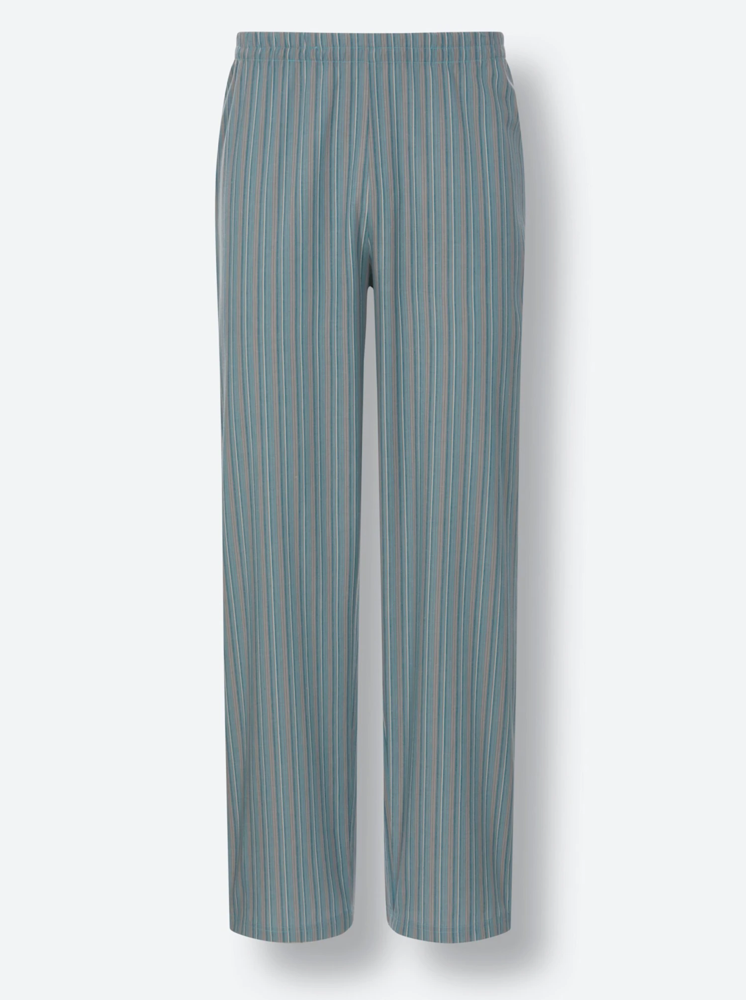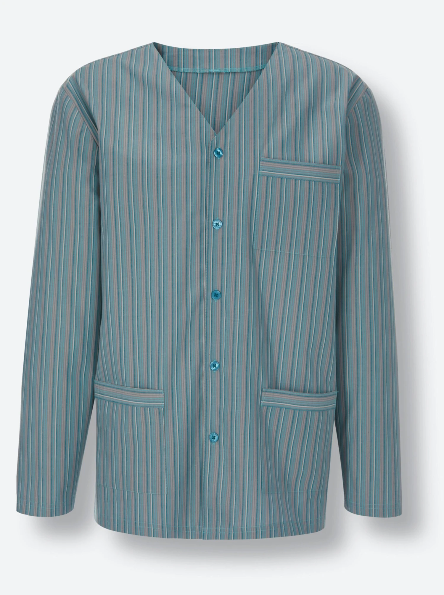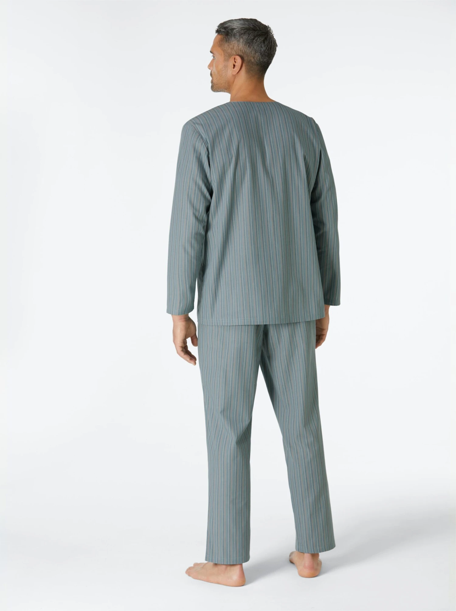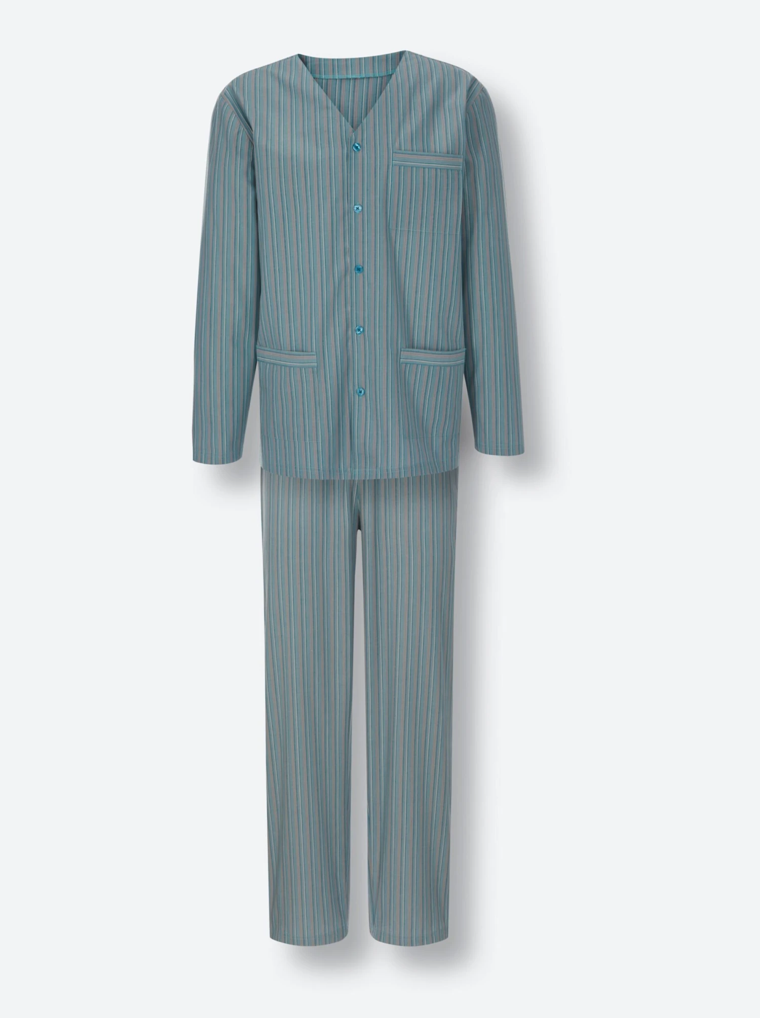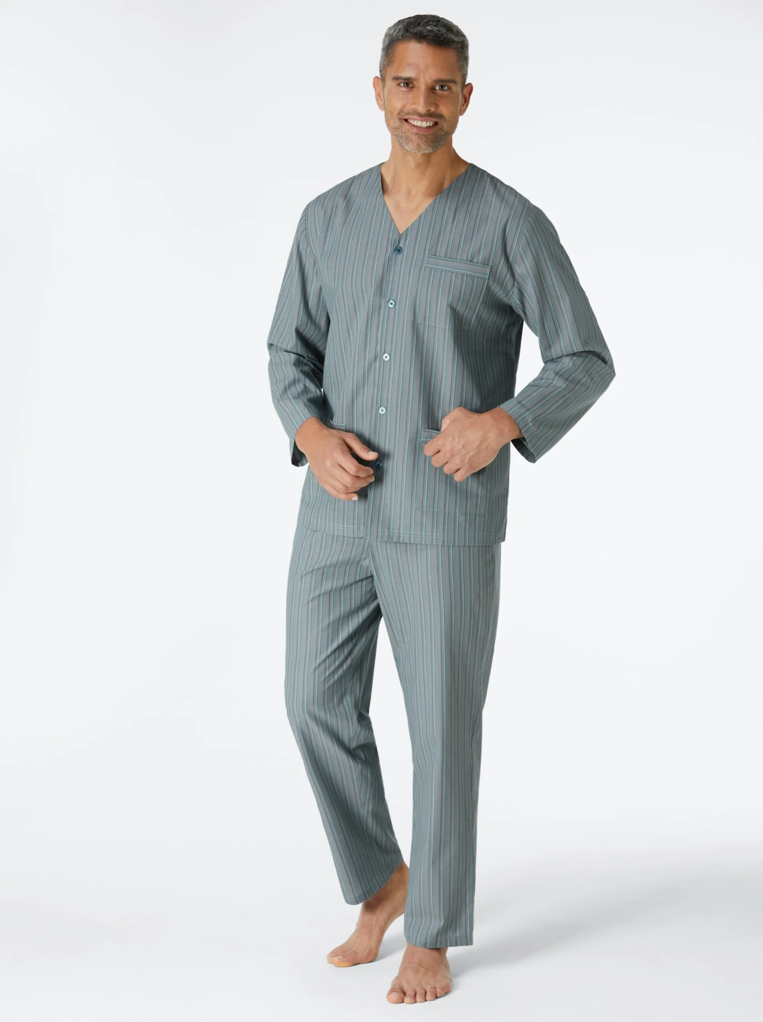 Im gewebten Streifendessin: Pyjama in Popeline-Qualität. V-Ausschnitt, durchgehende Knopfleiste, 3 Taschen. Lange Hose mit Dehnbund.