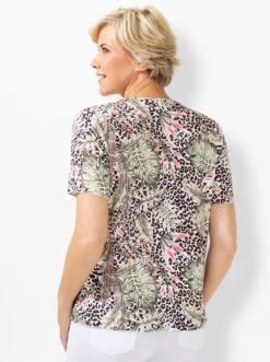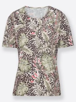 Einer unserer absoluten Sommer-Lieblinge: das Shirt im exotischen Mix aus Leo-Dessin und Palmenblätter-Print! Rundhals-Ausschnitt mit breitem Beleg, dekorativen Biesen und Steinchen. Bequeme Seitenschlitze.