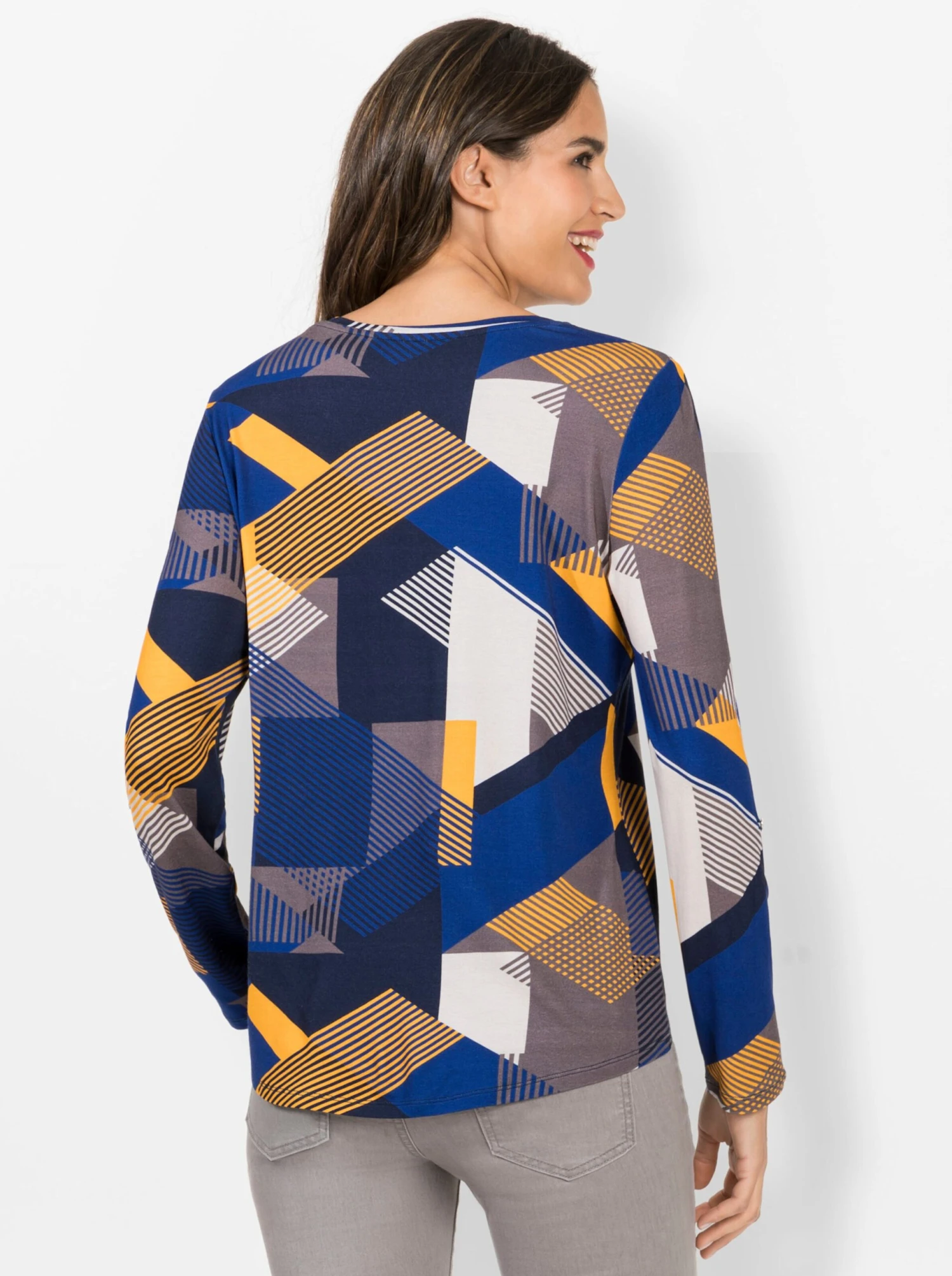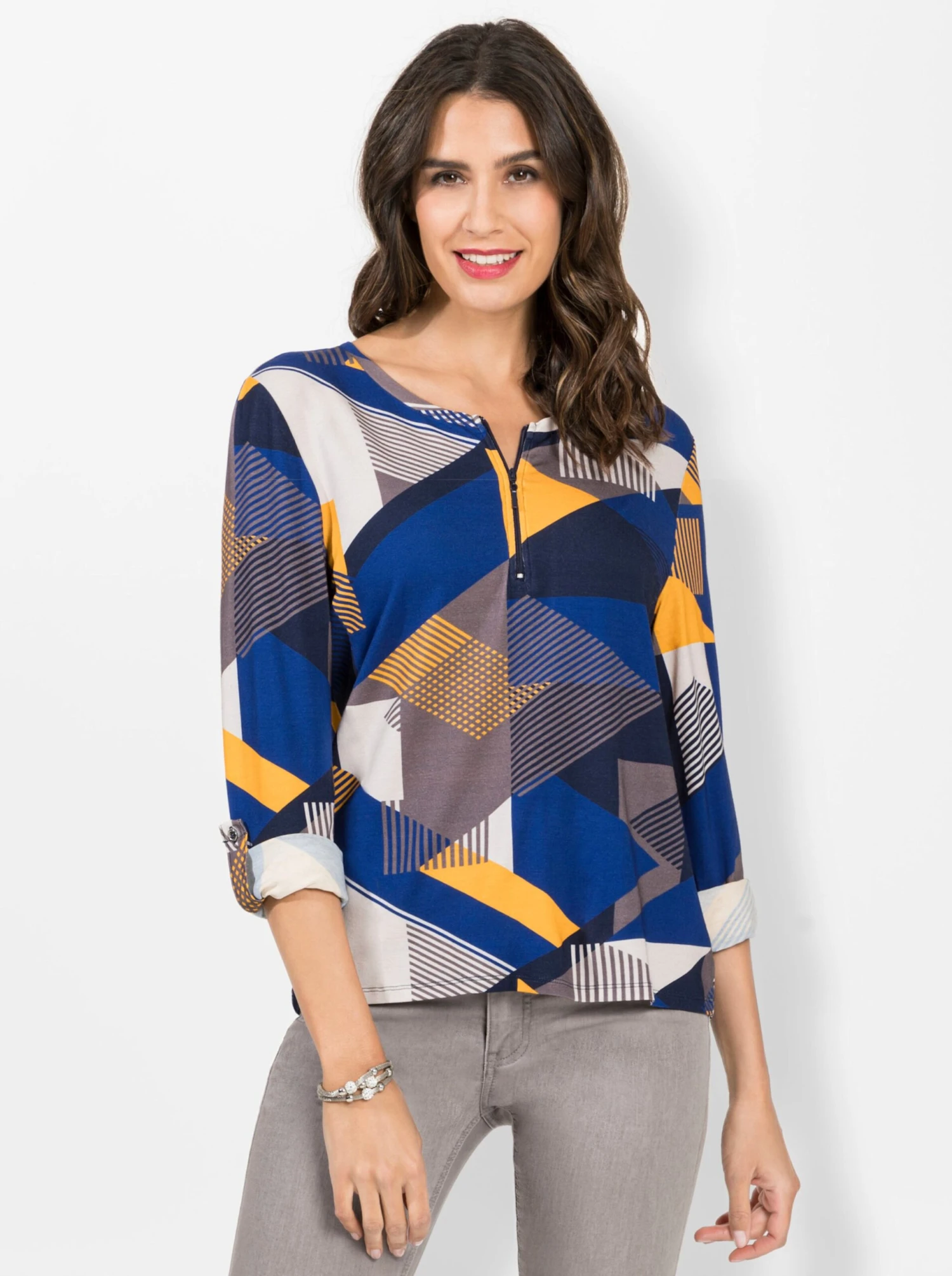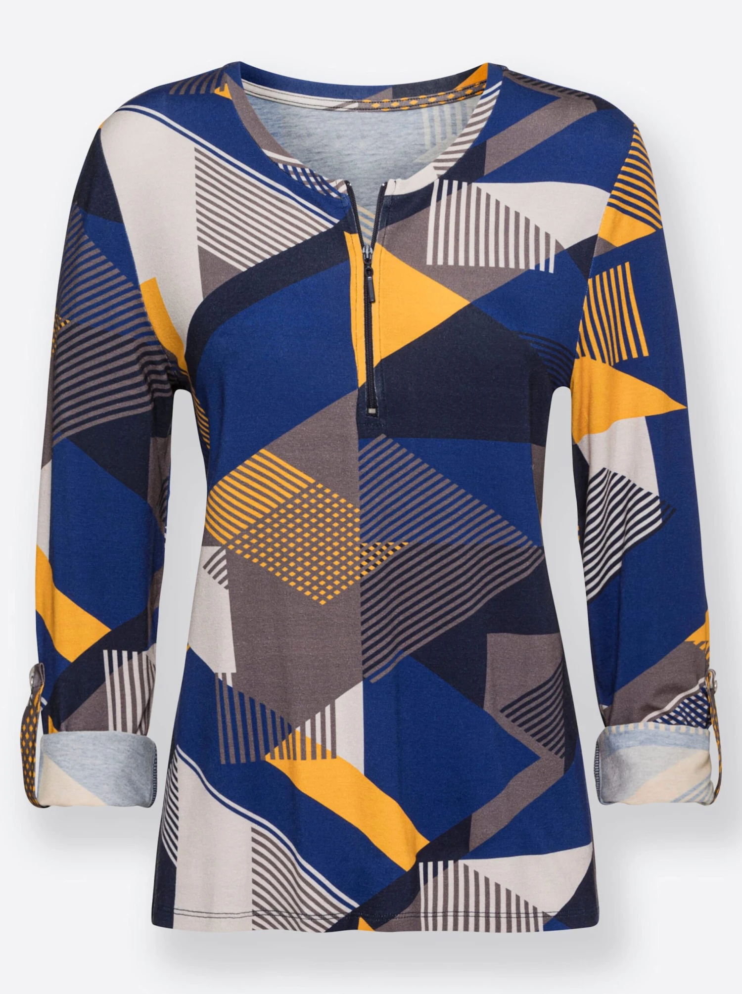 Absolut mustergültig! Shirt mit mehrfarbigem Grafikprint rundum. Rundhals-Ausschnitt und kurzer Reißverschluss. Die Ärmel lassen sich auf 3/4-Länge krempeln und dann mit Riegel und Knopf fixieren. Modisch hinten etwas länger geschnitten mit abgerundetem Saum.