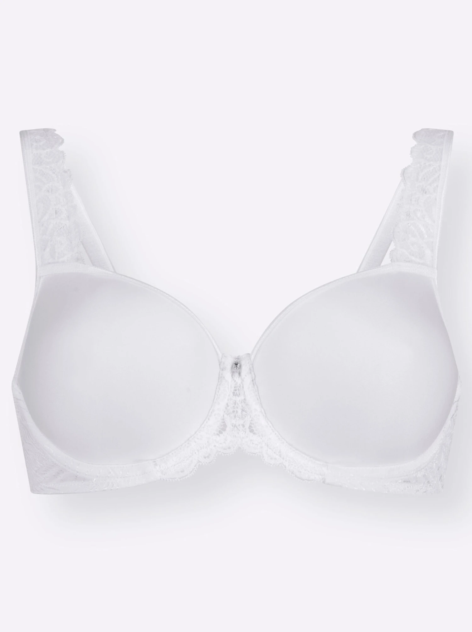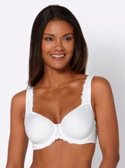 Dieser Schalen-BH mit Bügel von Viania wird durch die atmungsaktive Spacer-Qualität besonders bequem. Mit vorgeformten, atmungsaktiven Soft-Cups, die nahtlos verarbeitet sind und optimalen und bequemen Halt spenden – auch in großen Größen. Die feine Spitzenverzierung vorne und das glänzende Jacquard-Dessin im Rücken sorgen für die tolle Optik. Die leicht gepolsterten Träger sind mit einer filigranen Spitze überzogen und lassen sich im Rücken verstellen.