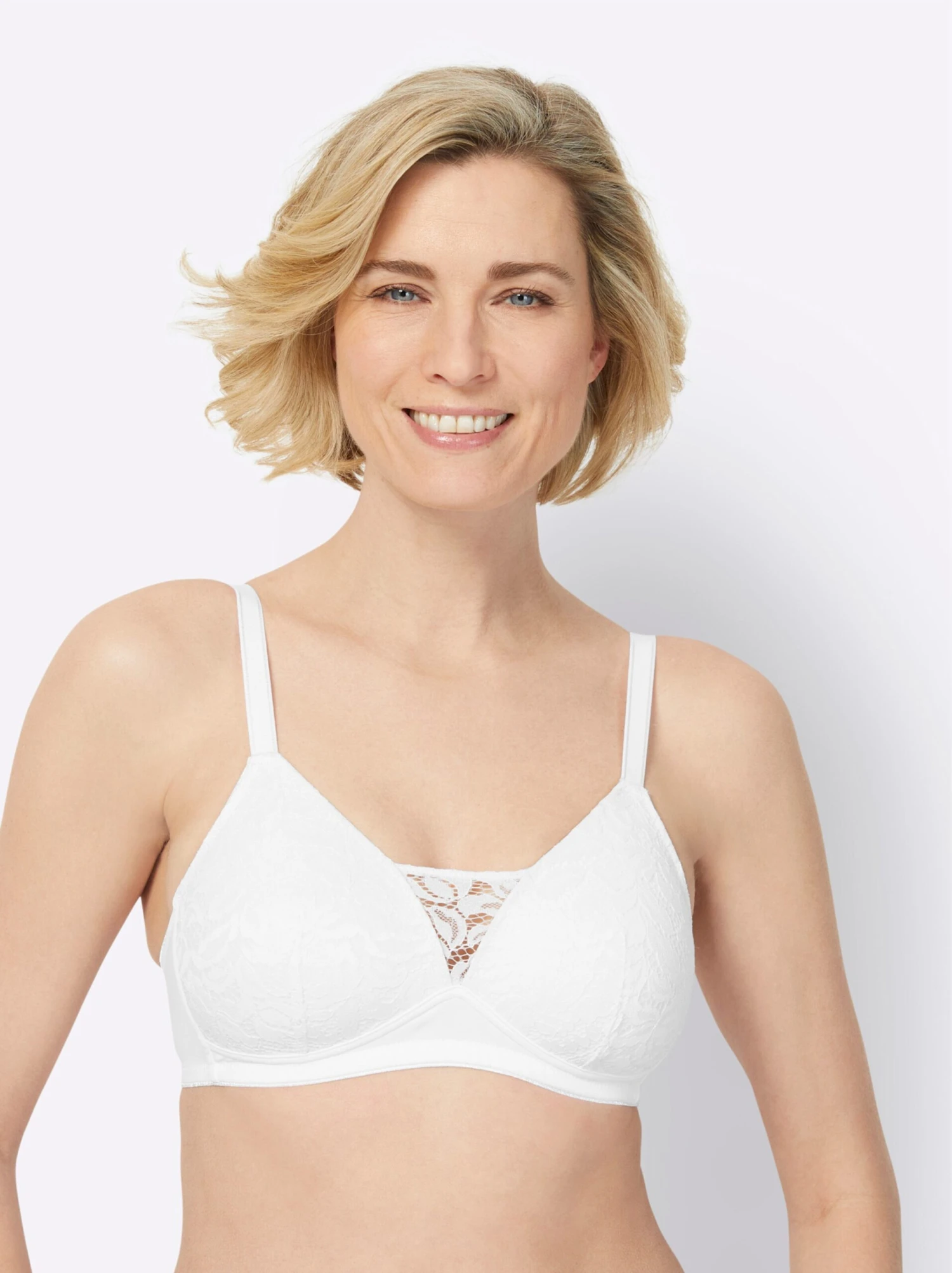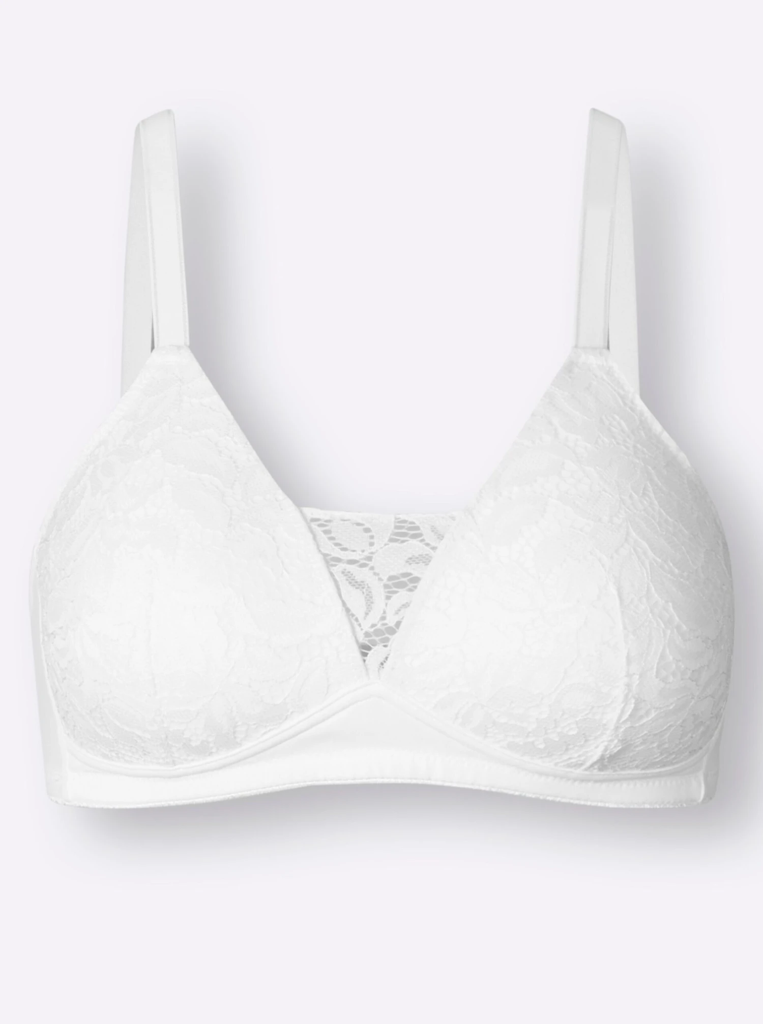 Unsere Form JASPIS: Schalen-BH ohne Bügel von wäschepur. Die Cups mit weichen Schalen sind mit einer filigranen, floralen Spitze verziert. Schön: der Spitzen-Einsatz am Dekolleté. Die Träger sind im Rücken verstellbar.