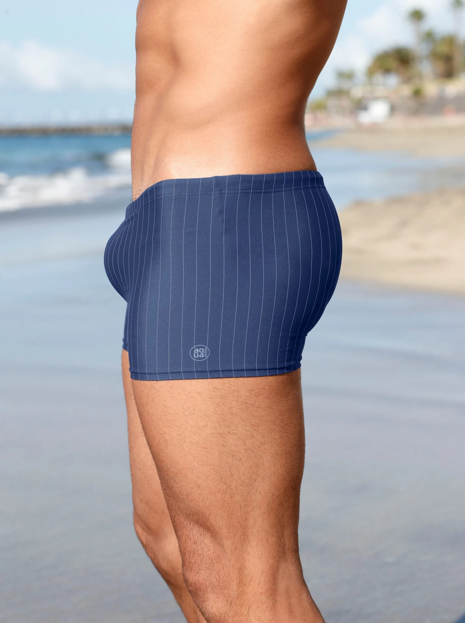 Sportive Badehose. Gummibund mit Bindeband. 1 praktische Reißverschluss-Tasche.