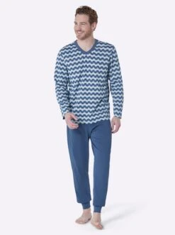 Immer eine gute Wahl! Schlafanzüge in beliebter Single-Jersey-Qualität mit aktuellem Dessin. Mit V-Ausschnitt und Kontrast-Paspelierung. Lange Hose mit Dehnbund. Elastische Bündchen an den Hosenbeinen. Unterstützt die Initiative Cotton made in Africa.