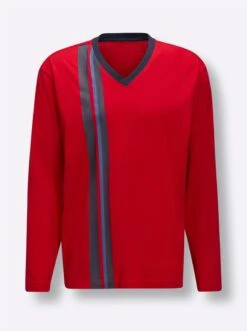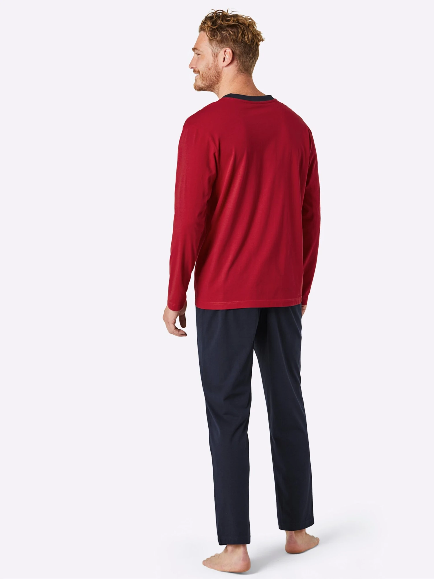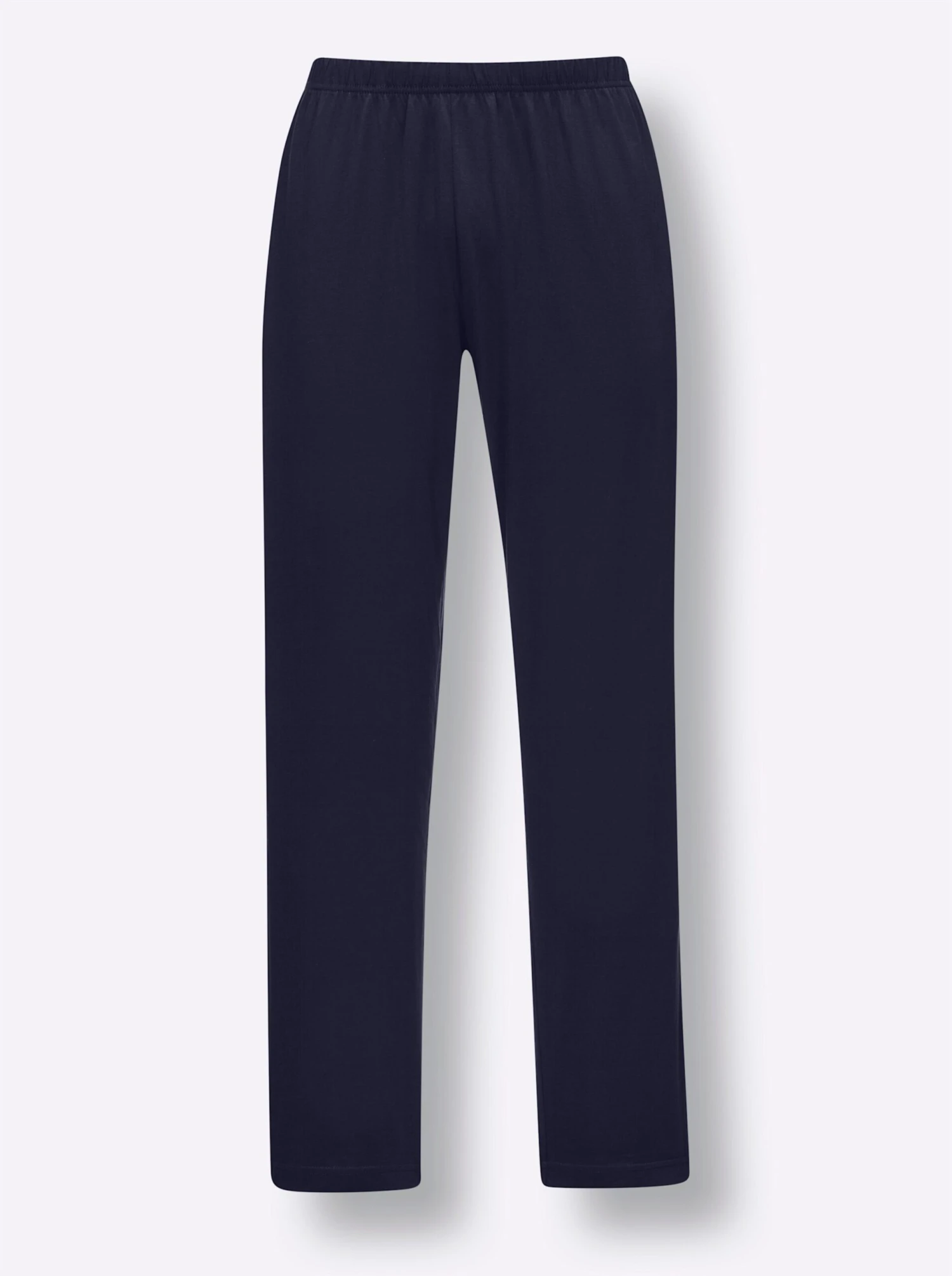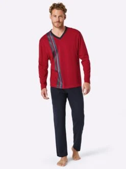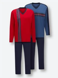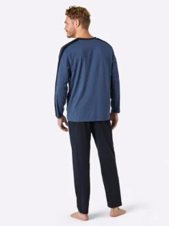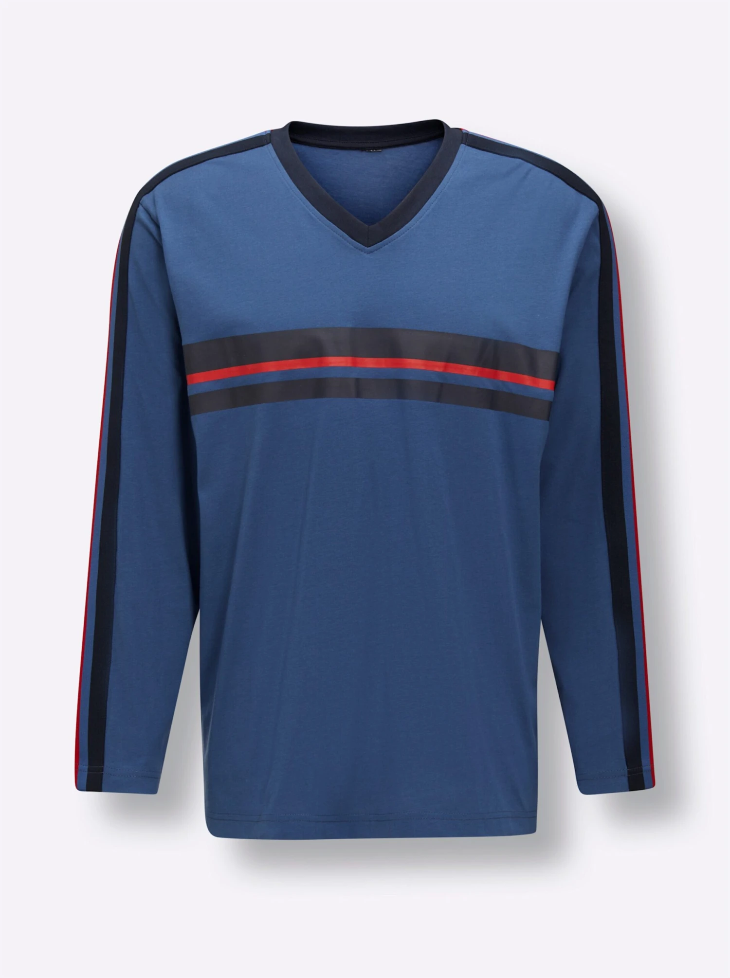 Die schönsten Streifen laufen hier bei uns: Schlafanzüge im tollen Dessin auf weicher, sehr trageangenehmer Single-Jersey-Qualität. Mit V-Ausschnitt. Lange Hosen mit Dehnbund. Farbe Jeansblau mit aufgenähtem, gewebtem Streifenband am Ärmel.