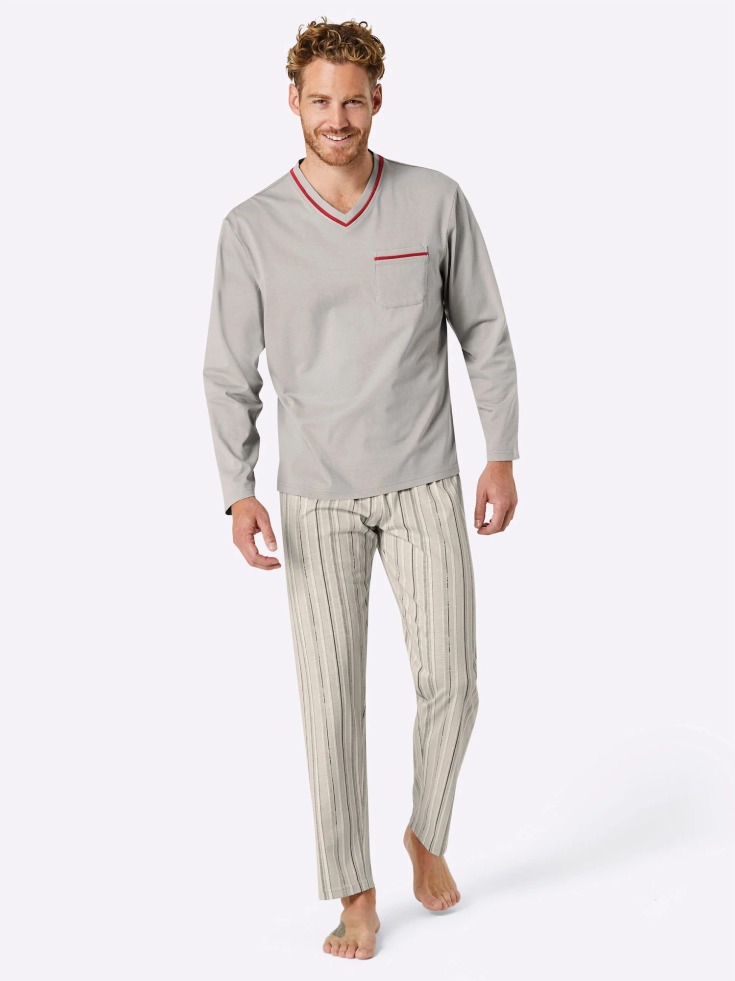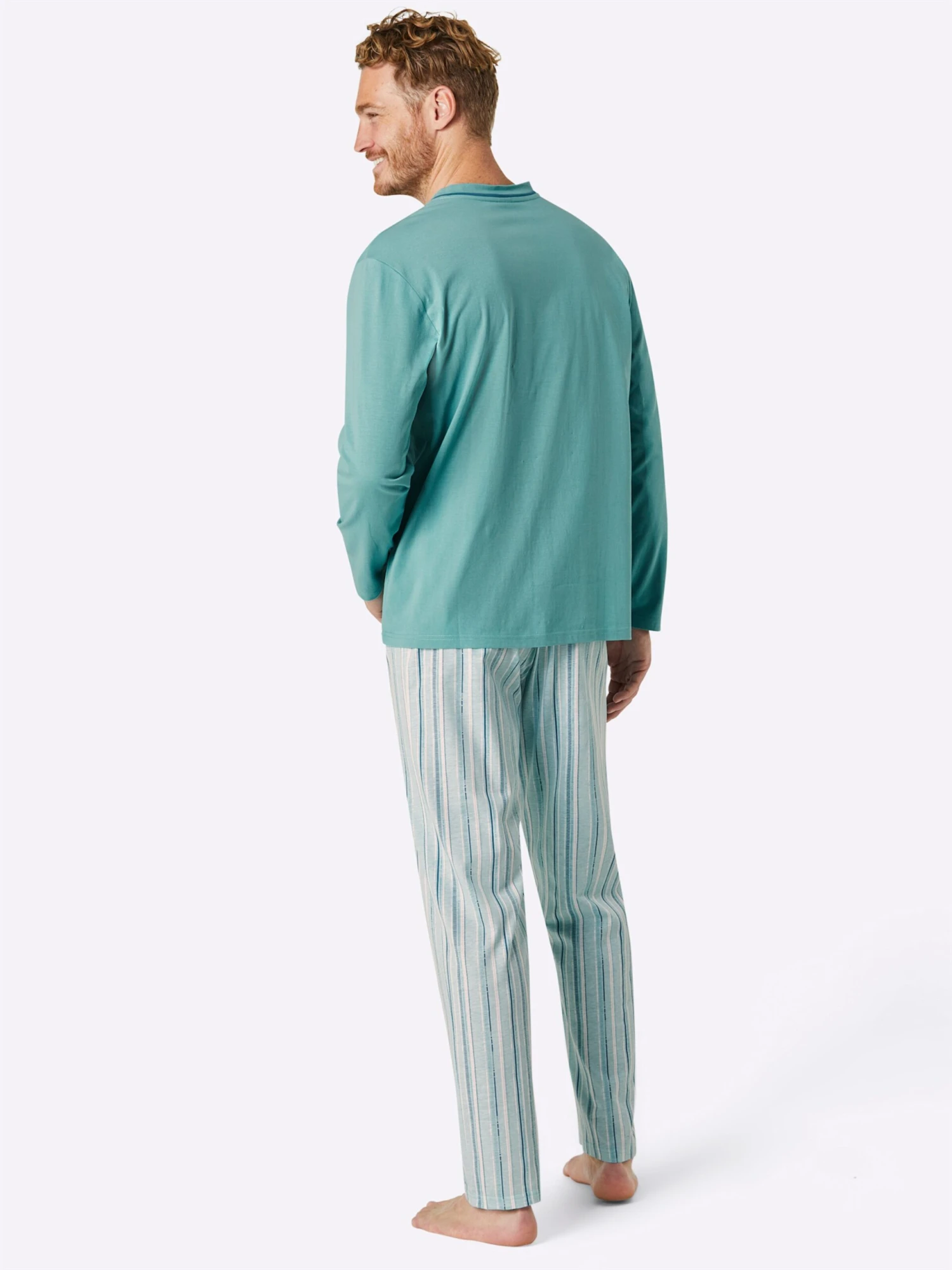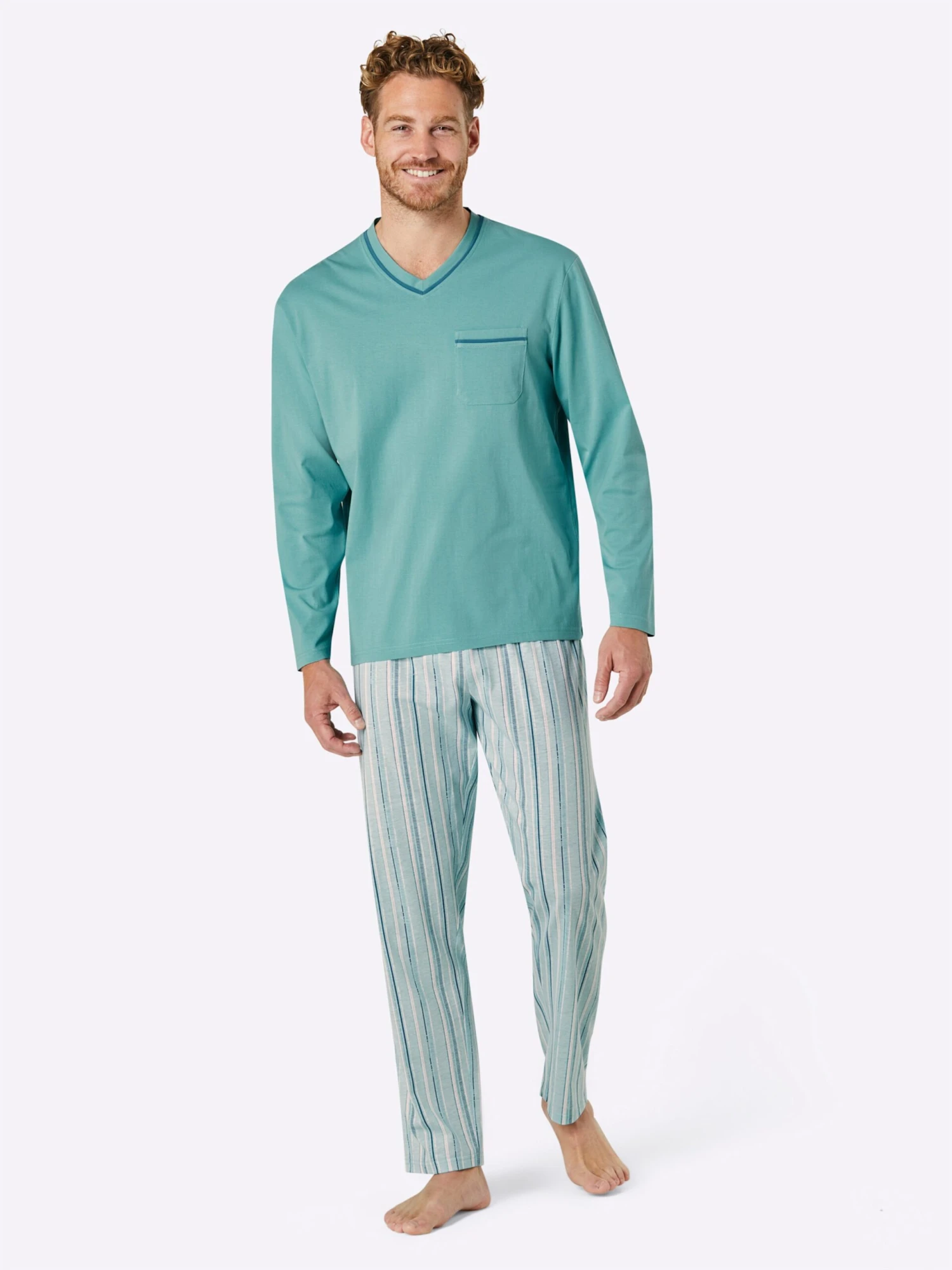 Bequemlichkeit pur im preiswerten Doppelpack: Schlafanzüge in angenehm weicher Single-Jersey-Qualität. Kontrastfarbige Paspelierung am V-Ausschnitt und an der Brusttasche. Gestreifte Hose mit Dehnbund.