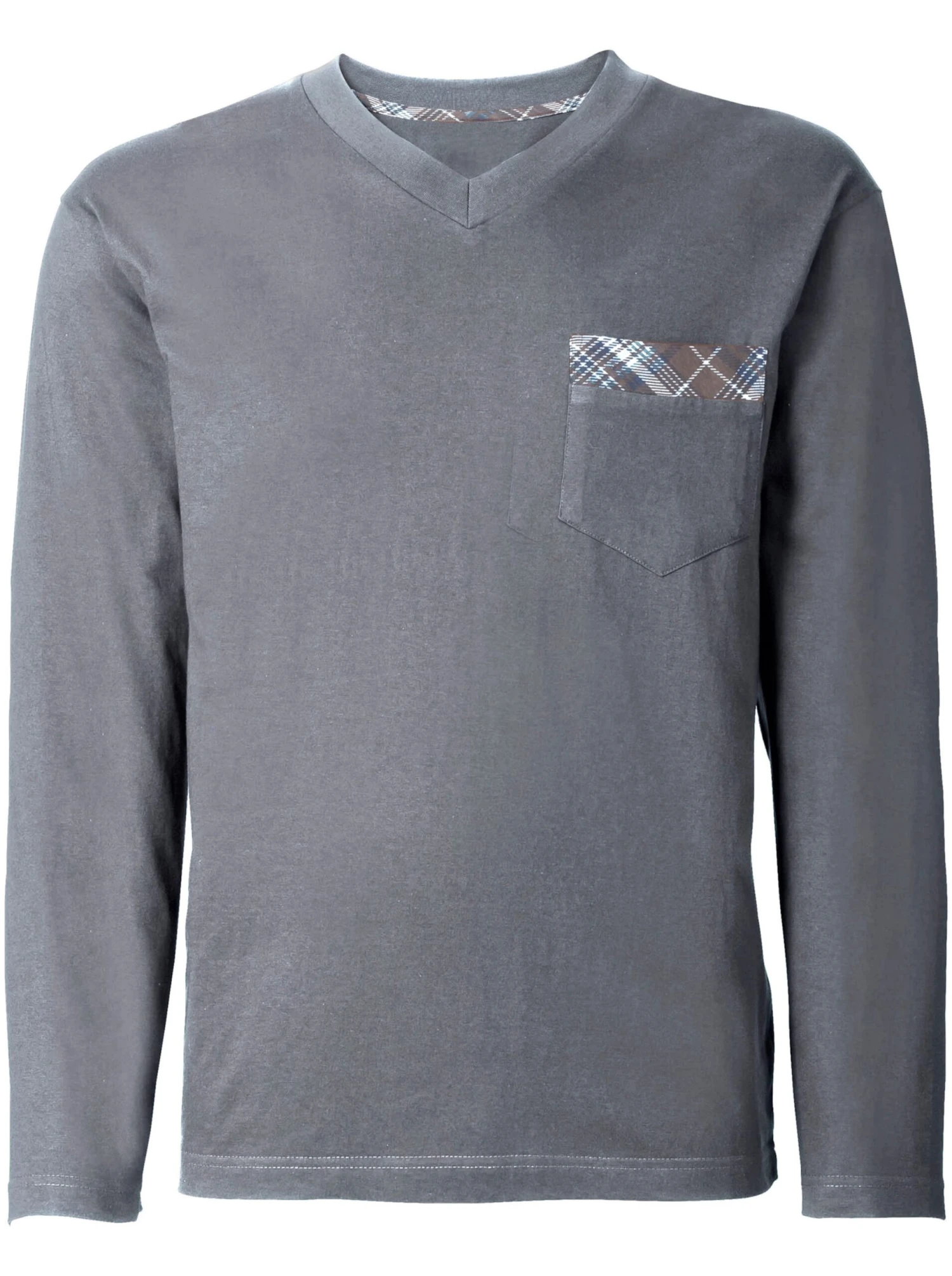 Gepflegte Optik in Top-Qualität! Schlafanzug mit geripptem V-Ausschnitt und karierter Blende an der Brusttasche. Die Dehnbund-Hose zeigt sich mit flottem Karo-Muster rundum. Single-Jersey.