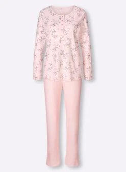 Wenn Sie leicht frieren, ist dieser extra flauschige, wärmende Schlafanzug genau das Richtige! In floralem Dessin. Mit Rundhals-Ausschnitt und langer Knopfleiste. Einfarbige, lange Hose mit Dehnbund. In Flausch-Jersey-Qualität, innen angeraut. Unterstützt die Initiative Cotton made in Africa.