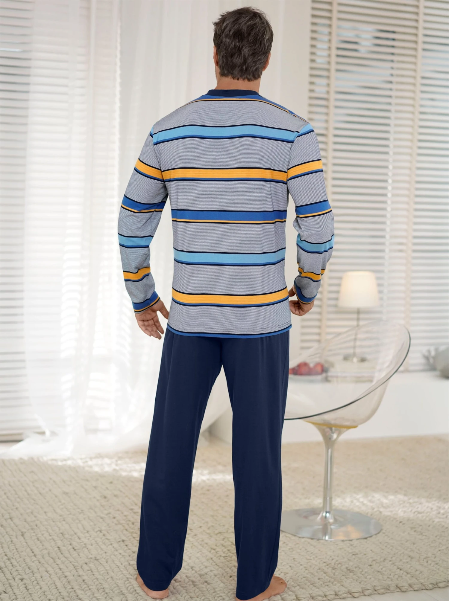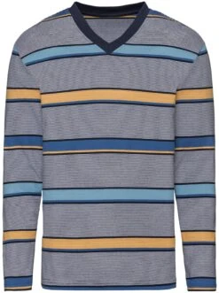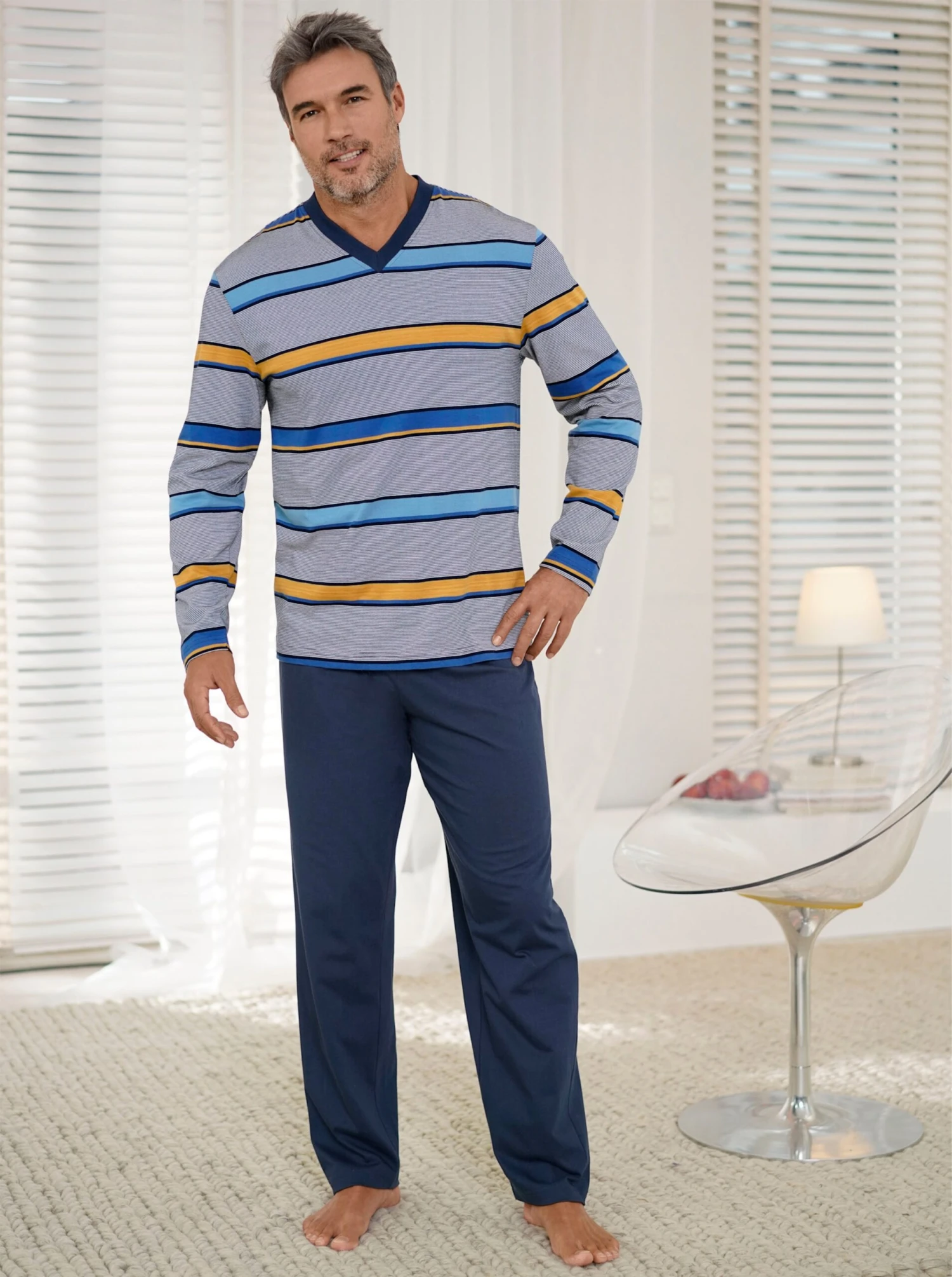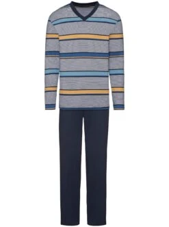 Rundum komfortabel! Schlafanzug von wäschepur im garngefärbten Streifendessin. Oberteil mit kontrastfarbiger Blende am V-Ausschnitt. Einfarbige Hose mit Dehnbund. Single-Jersey. GOTS-zertifiziert.