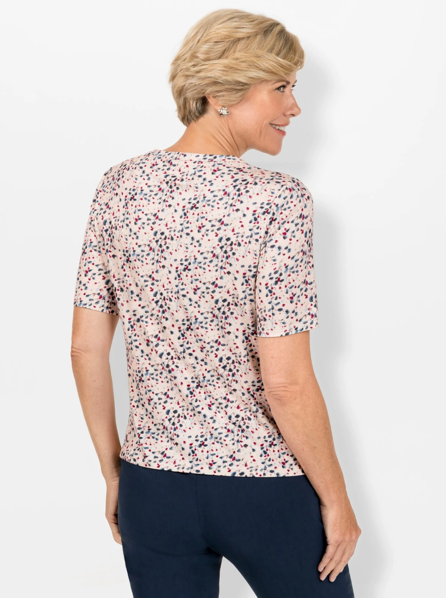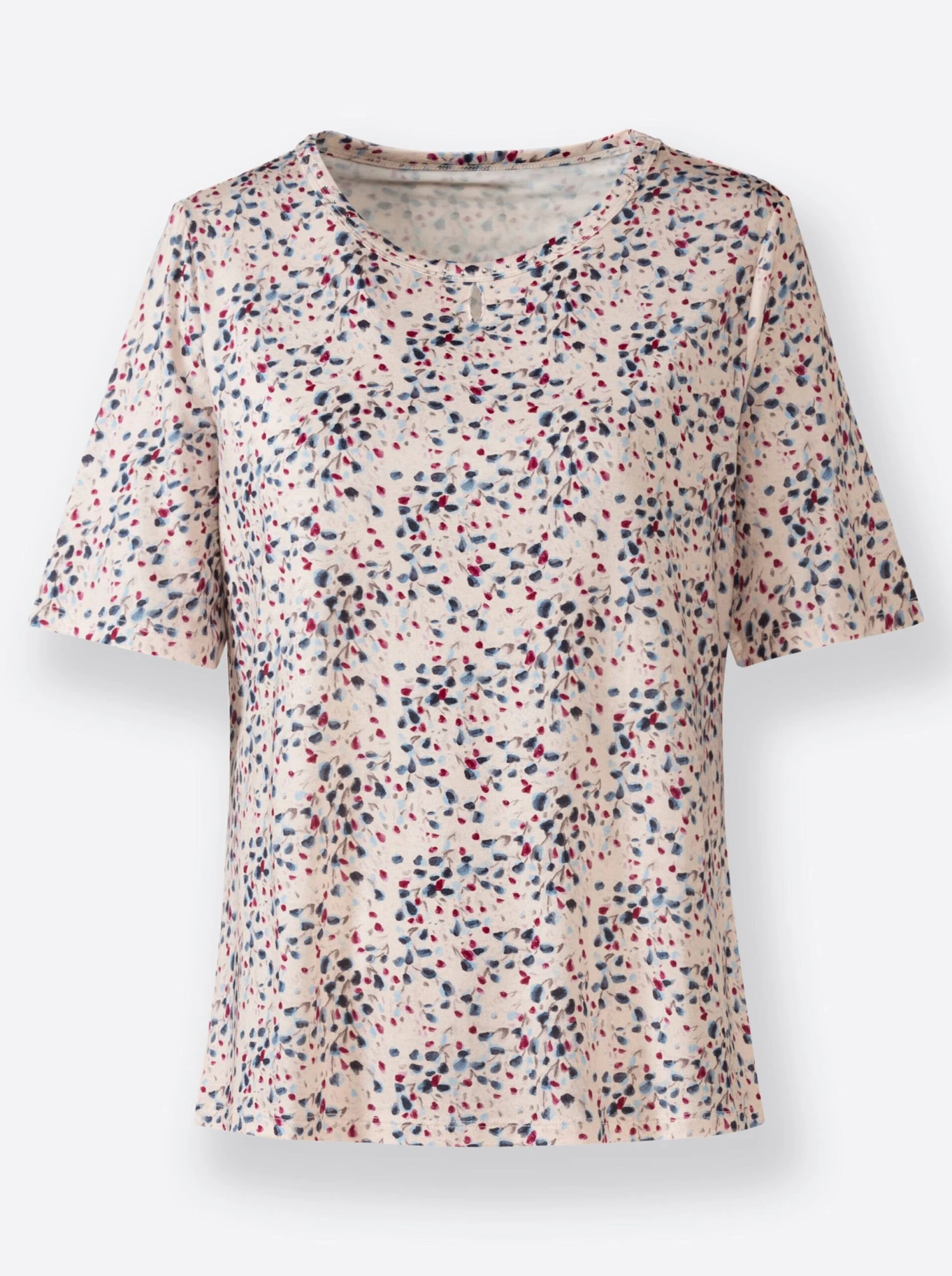 Das kombifreundliche Shirt glänzt durch die Glitzersteinchen am Rundhals-Ausschnitt mit Tropfen-Aussparung. Geschmeidig weiche Viskose-Stretch-Qualität.