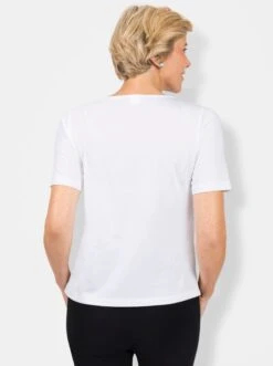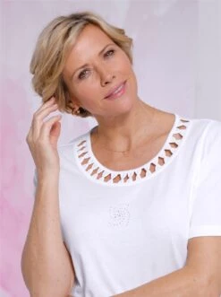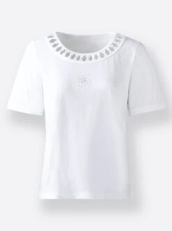 Attraktiver Kombipartner in hochwertiger, besonders weicher Materialmischung: Shirt mit dekorativer Ausschnittlösung und funkelnden Glitzersteinchen vorne. Kurze Ärmel. Mit dem Kauf unterstützen Sie die Initiative Cotton made in Africa.
