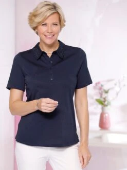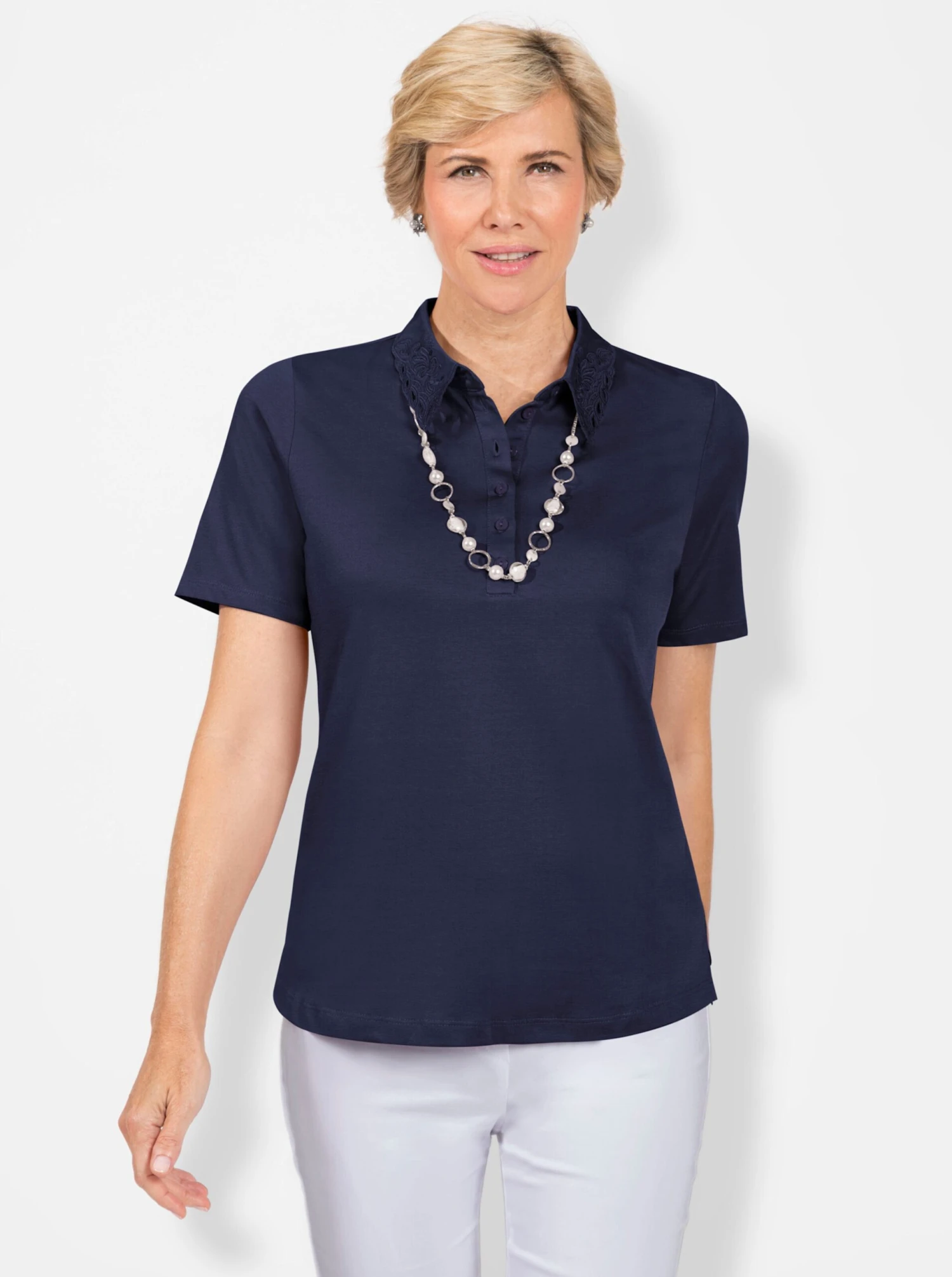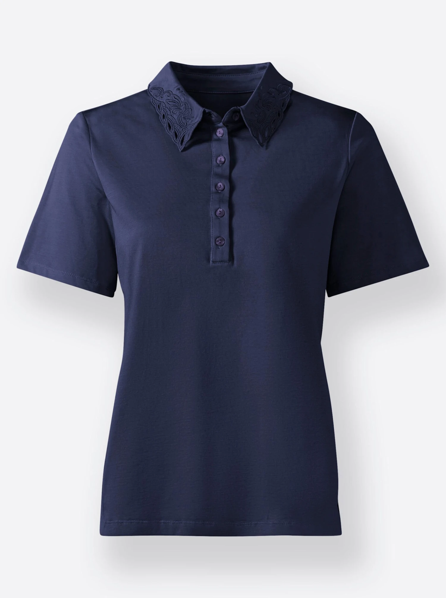 Das Shirt besticht durch die atmungsaktive Super Jersey-Qualität und den Polokragen mit Stickerei und effektvollen Aussparungen. Gebogte Abschlüsse am Kragen. Mit Knopfleiste und Seitenschlitzen. Mit dem Kauf unterstützen Sie die Initiative Cotton made in Africa.