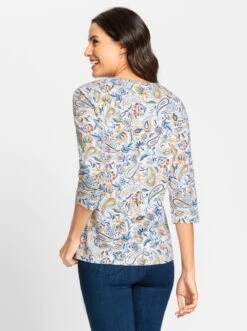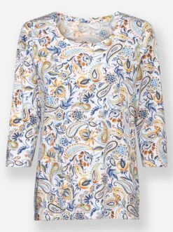 Das Shirt in weicher Qualität bekommt seine attraktive Ausstrahlung durch den Dessinmix aus Blüten- und Paisley-Elementen. Mit Rundhals-Ausschnitt und 3/4-Ärmel. Unterstützt die Initiative Cotton made in Africa.