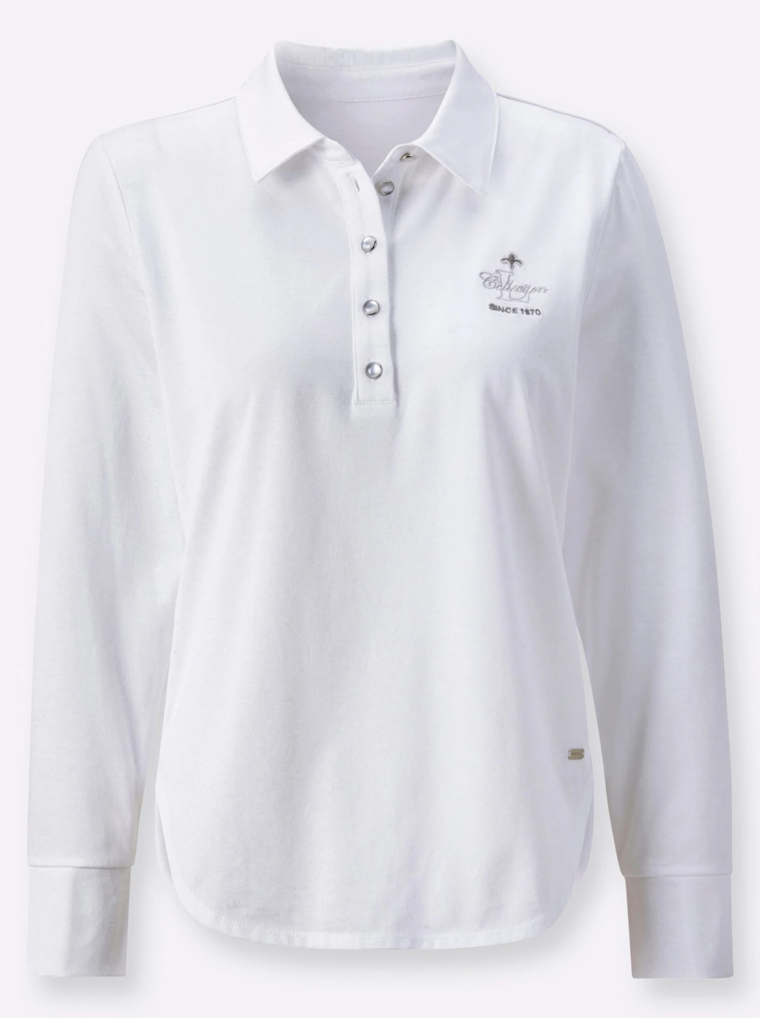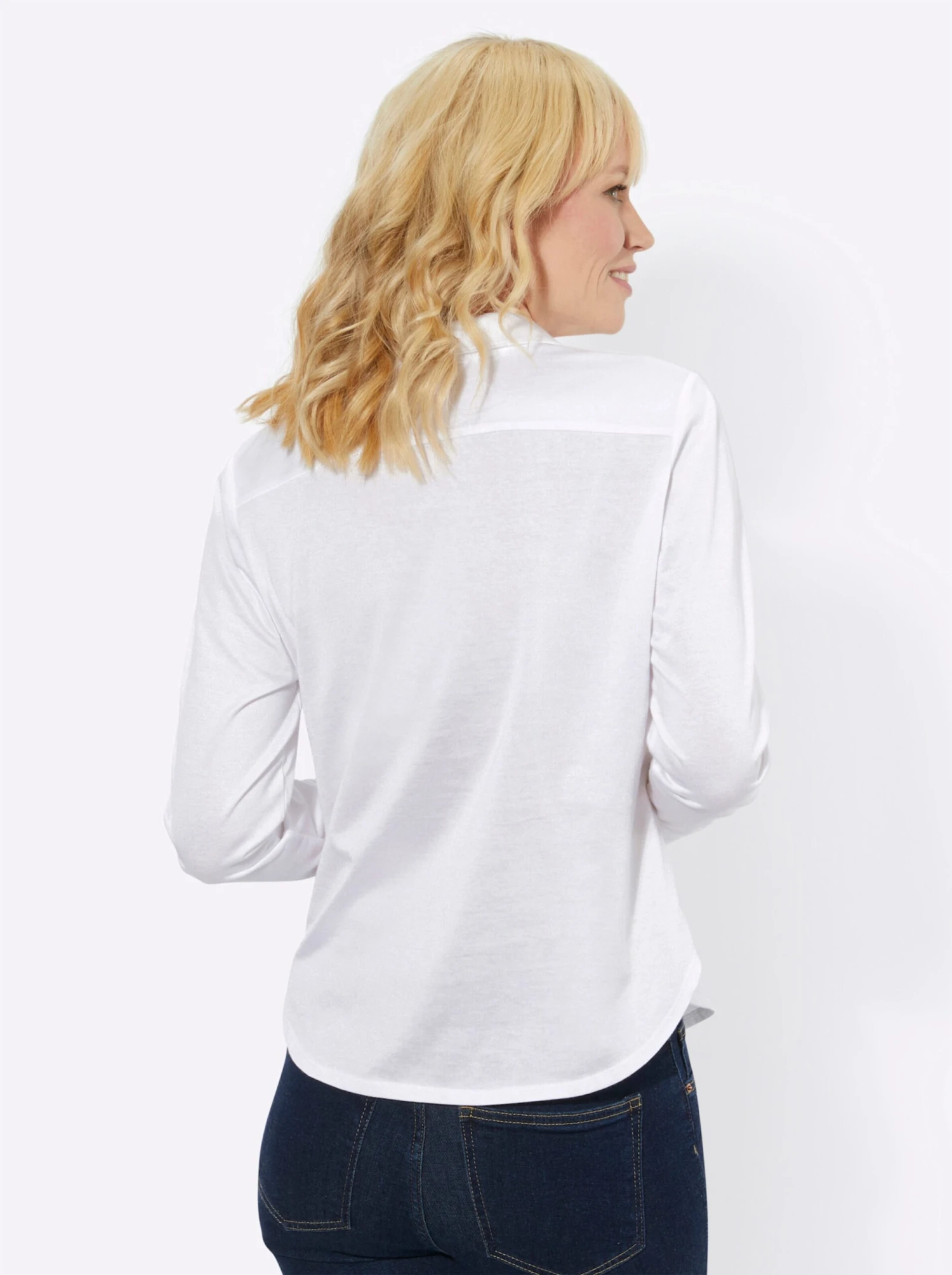 Legeres Shirt mit Polokragen und schimmernden Knöpfen. Dekorative Stickerei auf der Brusttasche. Lange Ärmel mit Schlitz und Aufschlag. Der Saum ist leicht abgerundet. Unterstützt die Initiative Cotton made in Africa.
