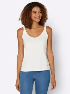 Ob solo oder in Kombination mit Bluse und Co. Dieses Shirttop ist ein tolles Basic für viele Gelegenheiten! Tiefer, paspelierter Rundhals-Ausschnitt mit etwas breiteren Trägern.