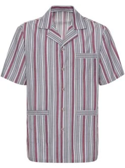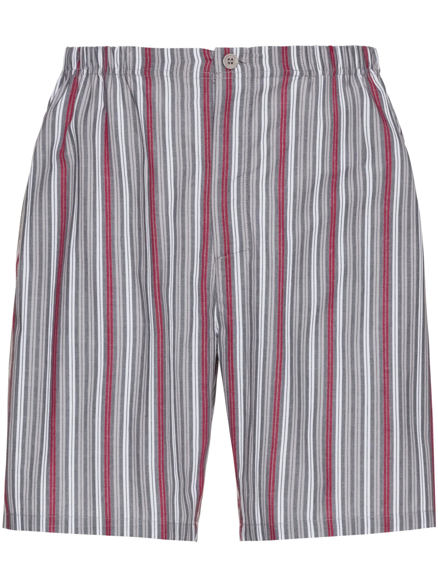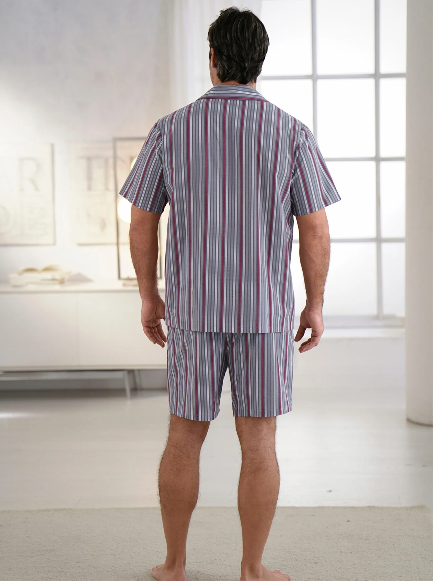 Shorty von King`s Club in angenehm leichter Popeline-Qualität in garngefärbtem Streifenmuster. Mit Reverskragen, Knopfleiste, Brusttasche und 2 Hüfttaschen. Kurze Hose mit bequemem Dehnbund und geknöpftem Schlitz.