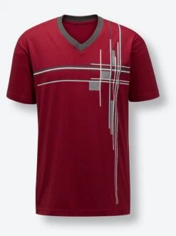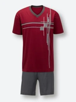 Sommerlicher Shorty aus luftigem Single-Jersey. Oberteil mit platziertem Druckmuster und paspeliertem V-Ausschnitt. Dehnbund-Hose mit 2 Taschen an den Seiten.