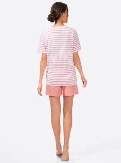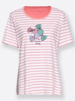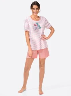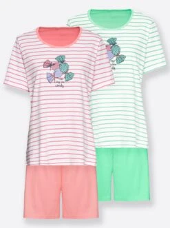 Frech mal zwei – zuckersüße Shortys von Comtessa im Doppelpack. Das Oberteil im garngefärbten Ringel-Dessin ziert ein platzierter Bonbon-Druck. Mit kontrastfarbigem Rundhals-Ausschnitt und kurzen Ärmeln. Die bequeme, kurze Hose mit elastischem Dehnbund bleibt einfarbig. In angenehmer Single-Jersey-Qualität.
