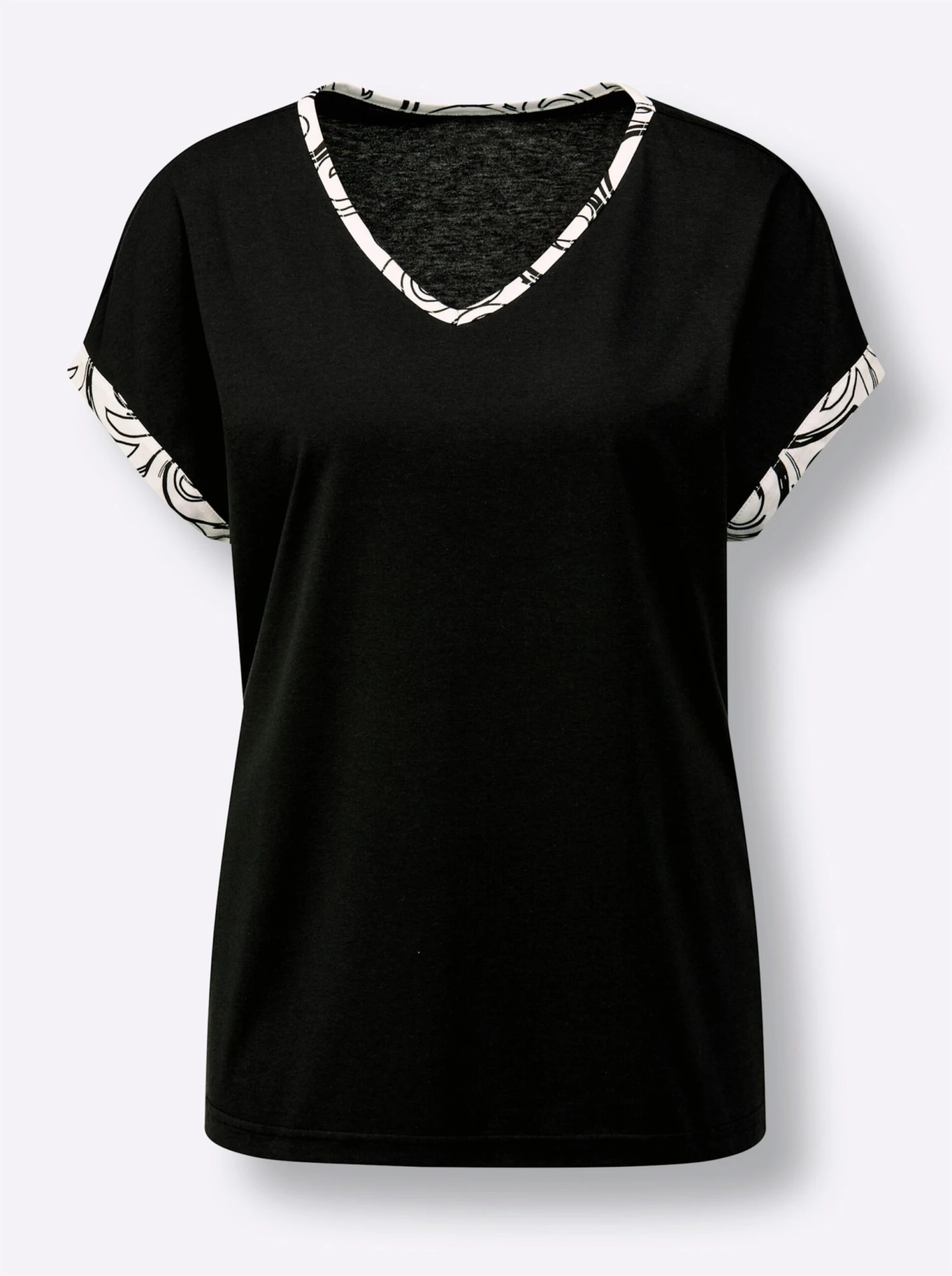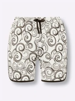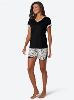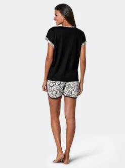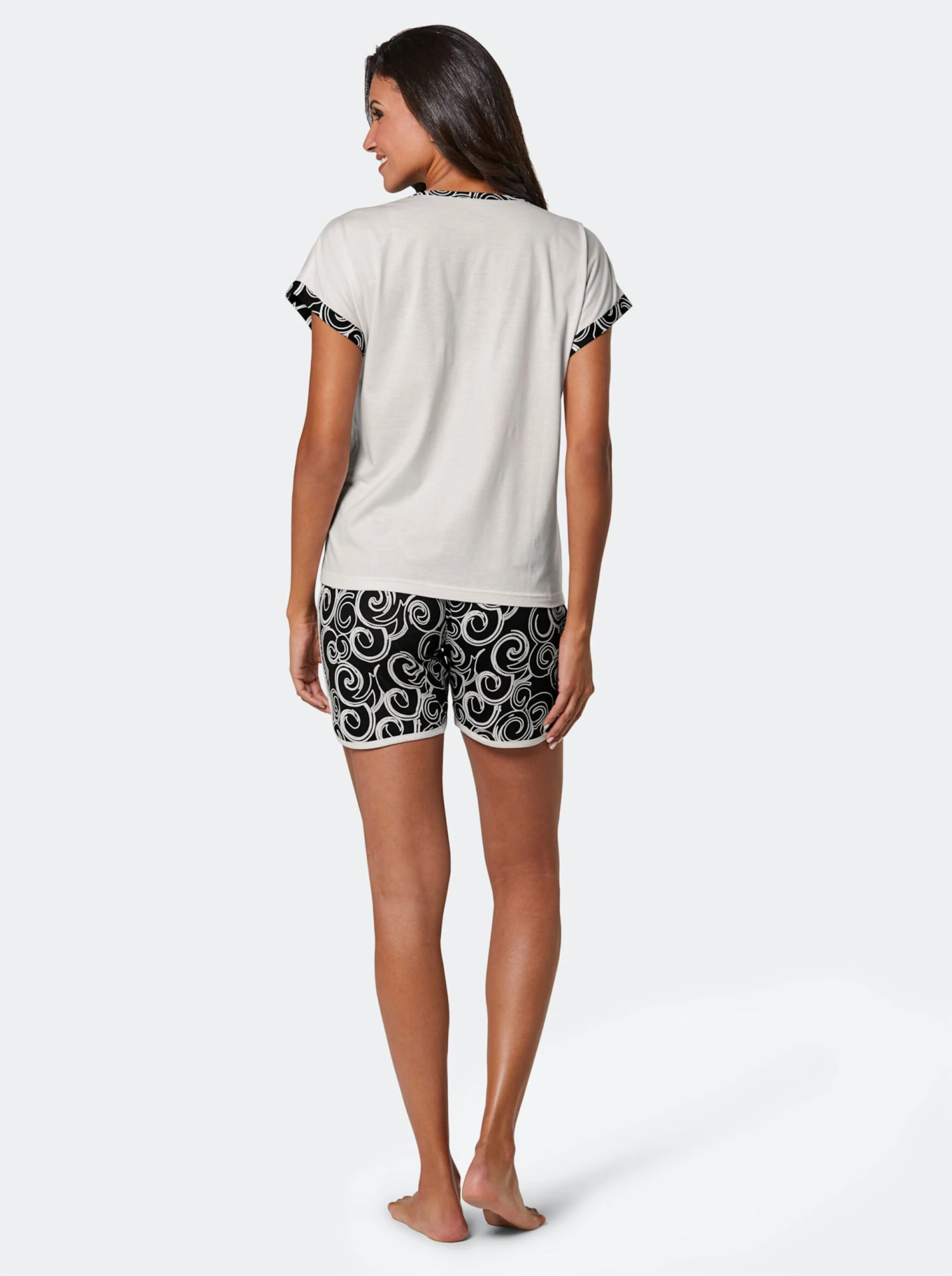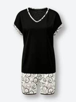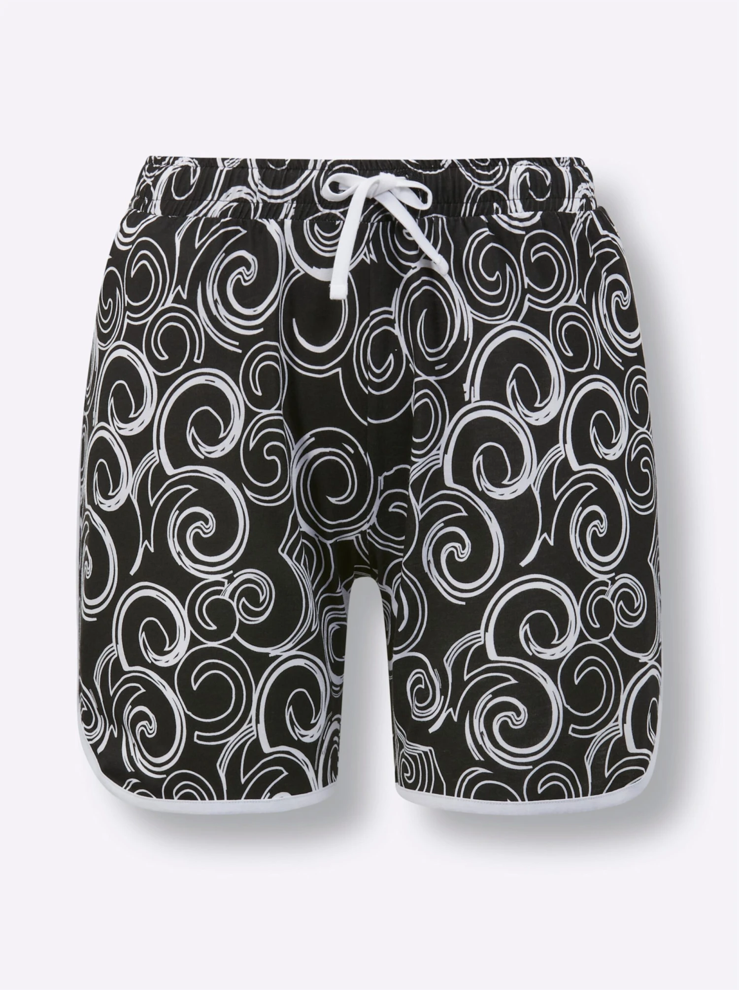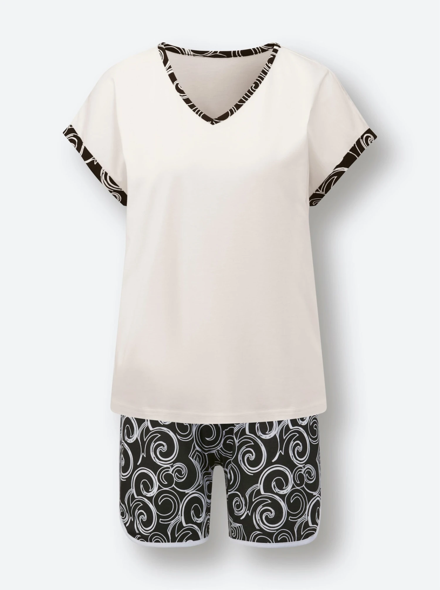 Zum Träumen gemacht sind diese wunderschönen Shortys! V-Ausschnitt und überschnittene Schultern dekoriert mit Kontrastpaspel. Allover bedruckte kurze Hose mit Dehnbund und Bindeband. Fußschlitze und Kontrastpaspeln am Beinabschluss. In Single-Jersey-Qualität.