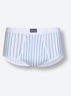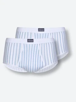 Klassisch gestreifter Slip mit Eingriff und doppeltem Weichgummibund im 2er Pack von King’s Club. Hohe Leibhöhe. Trageangenehme Feinripp-Qualität.