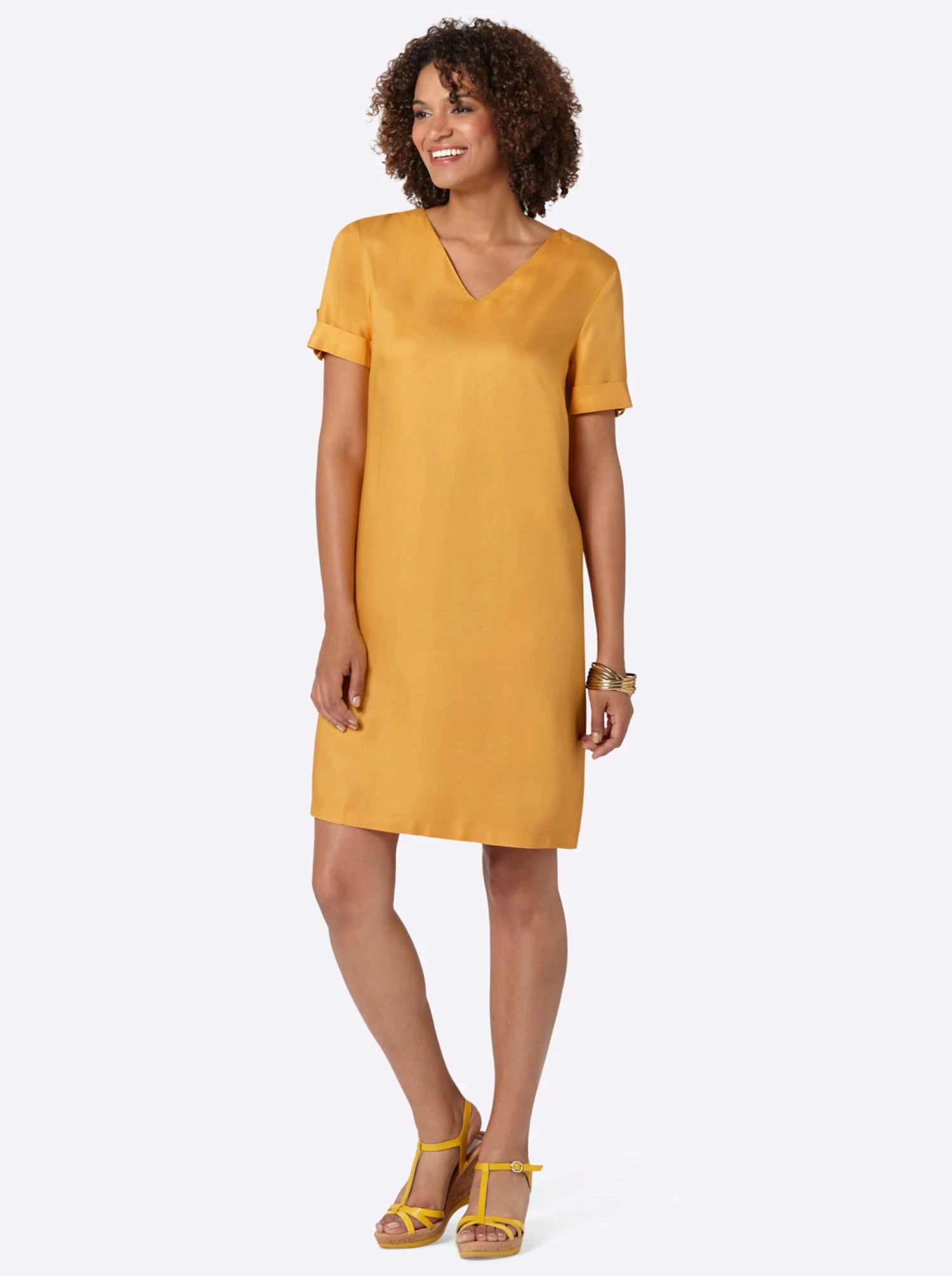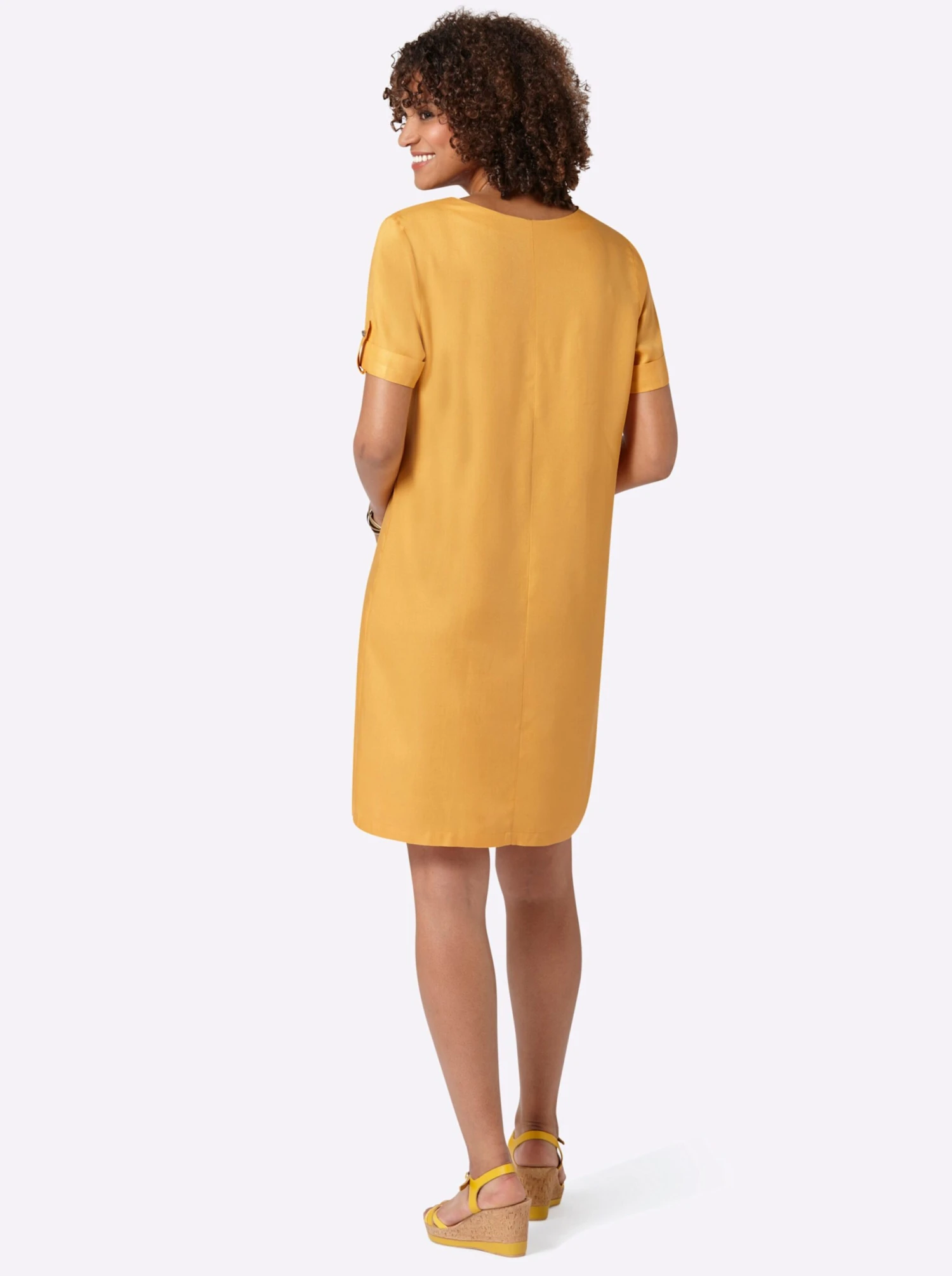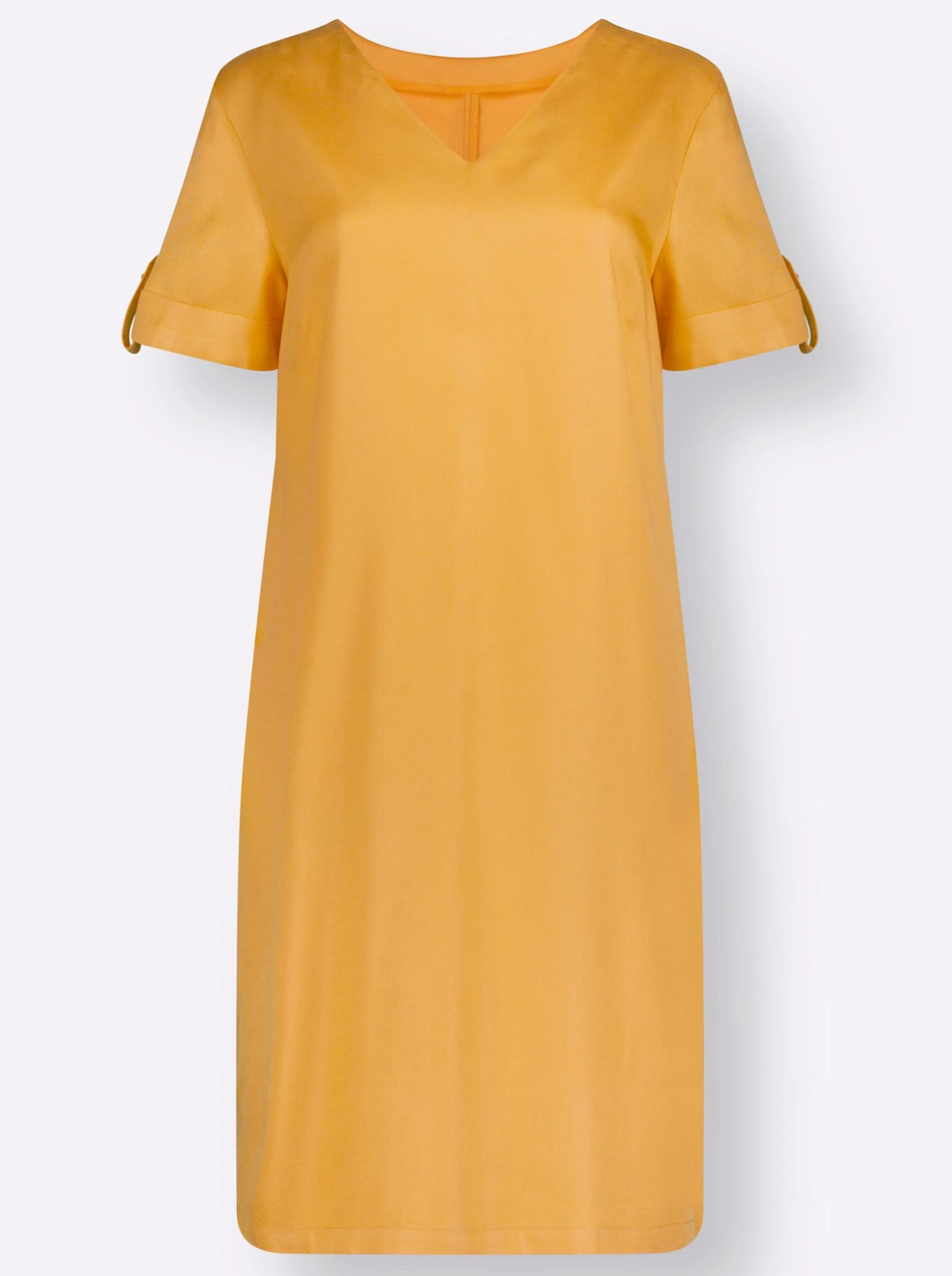 Reinschlüpfen. Wohlfühlen. Gut aussehen! Dieses Kleid erfüllt alle Voraussetzungen für Ihren neuen Sommer-Liebling! Tolle Qualität aus hochwertiger Twill-Viskose: wunderbar trageangenehm und weich fließend! V-Ausschnitt, Brustabnäher, kurze Ärmel mit Umschlag und Zierriegel.