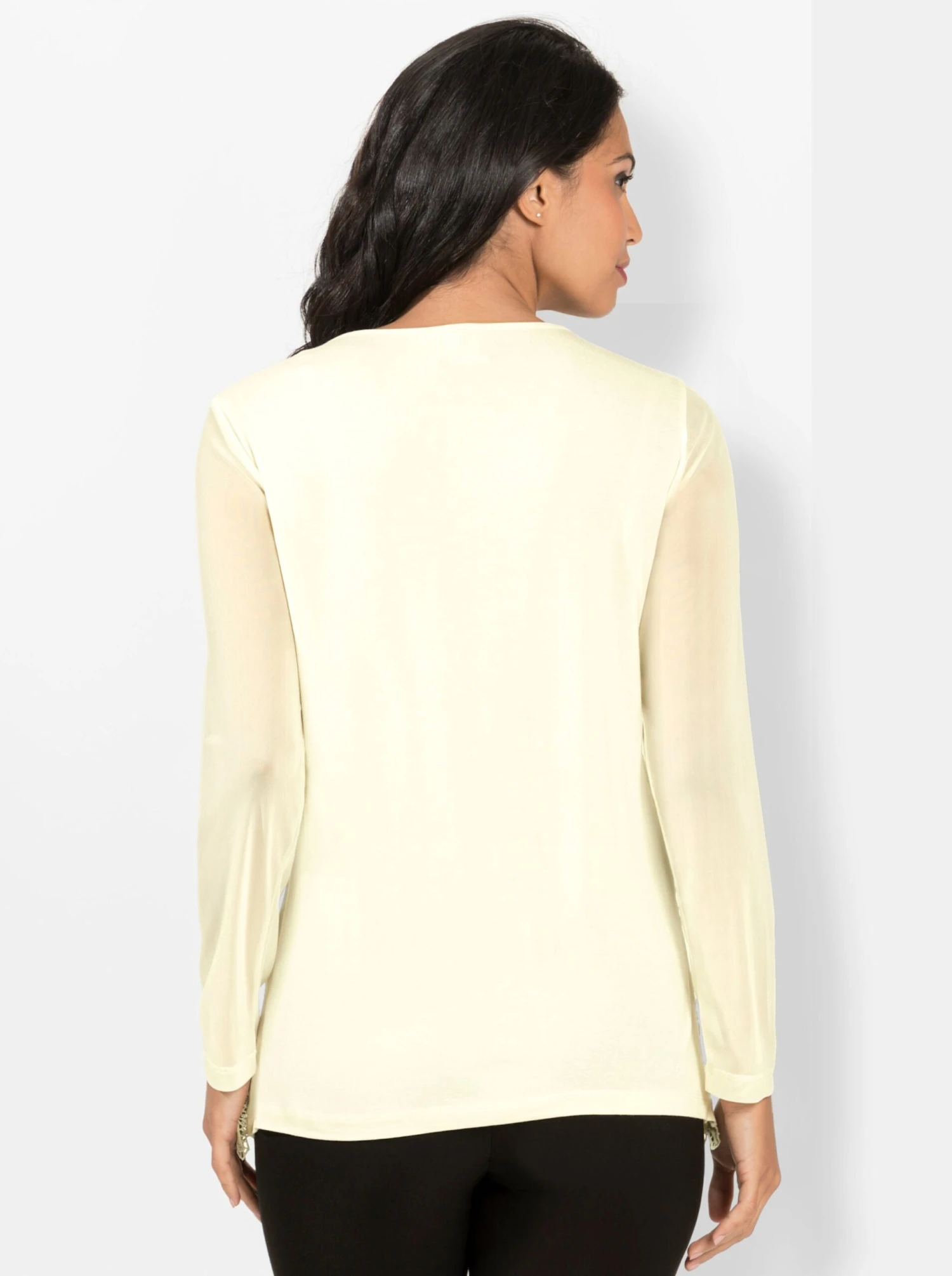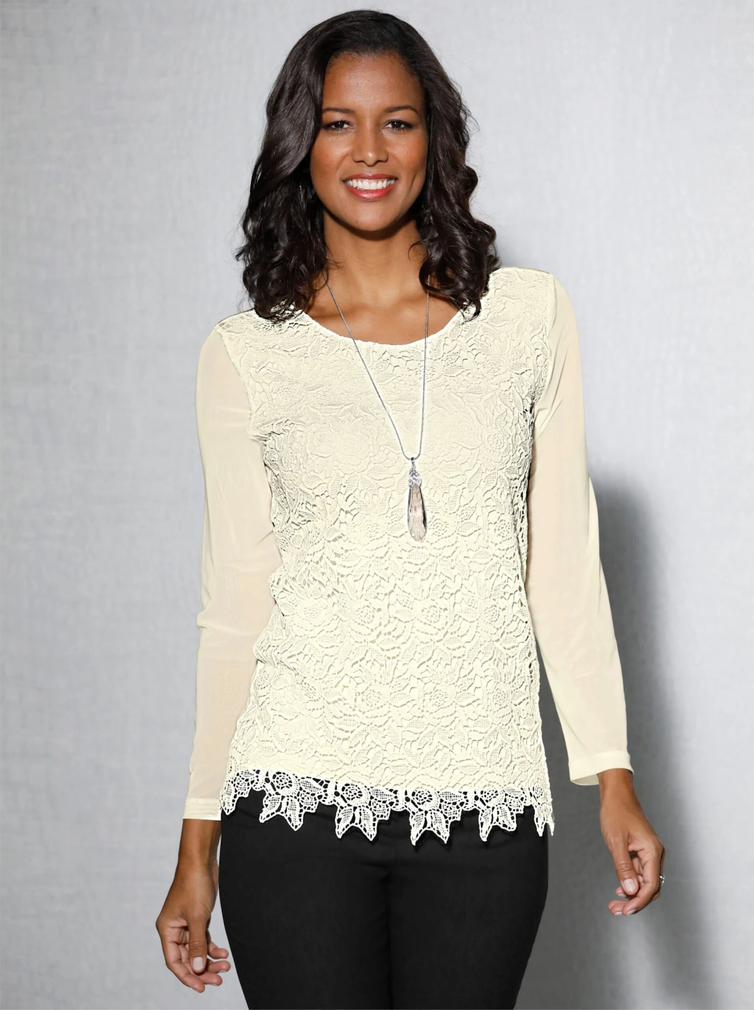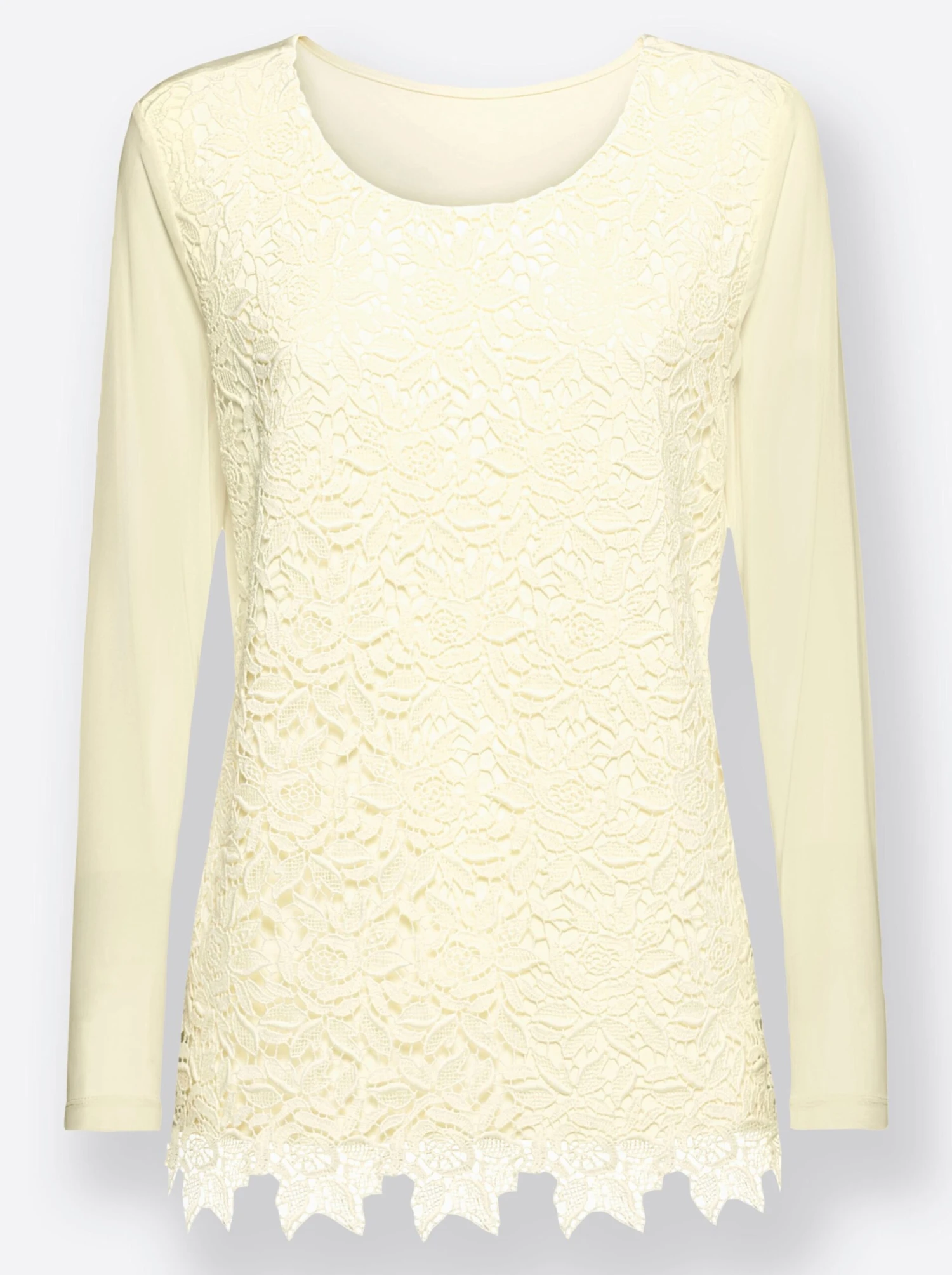 Mit diesem eleganten Shirt sind Sie sicher der Hingucker! In weicher Jersey-Qualität, vorne hübsche Blütenspitze mit gebogtem Saumabschluss. Die langen Ärmel sind aus elastischer, transparenter Mesh-Qualität gearbeitet.