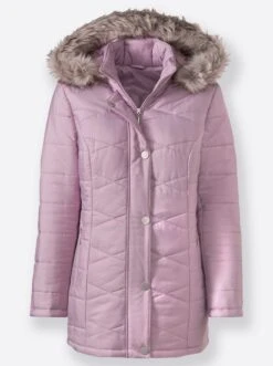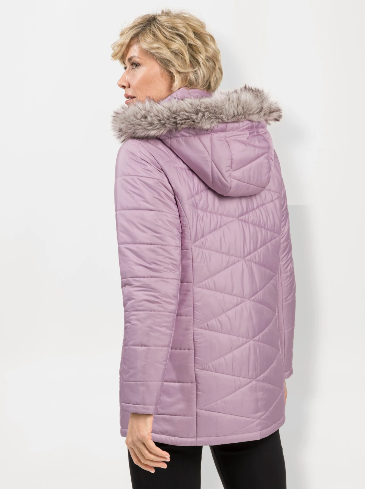 Ideal an kühlen Tagen! Wärmende Jacke im attraktiven Stepp-Mix. Stehkragen und durch Reißverschluss abnehmbare Kapuze mit Pelz-Imitat. Druckknopfleiste mit verdecktem Reißverschluss. Formende Teilungsnähte vorne und hinten. Seitliche Reißverschluss-Taschen. Knöpfbare Innentasche.