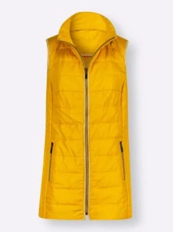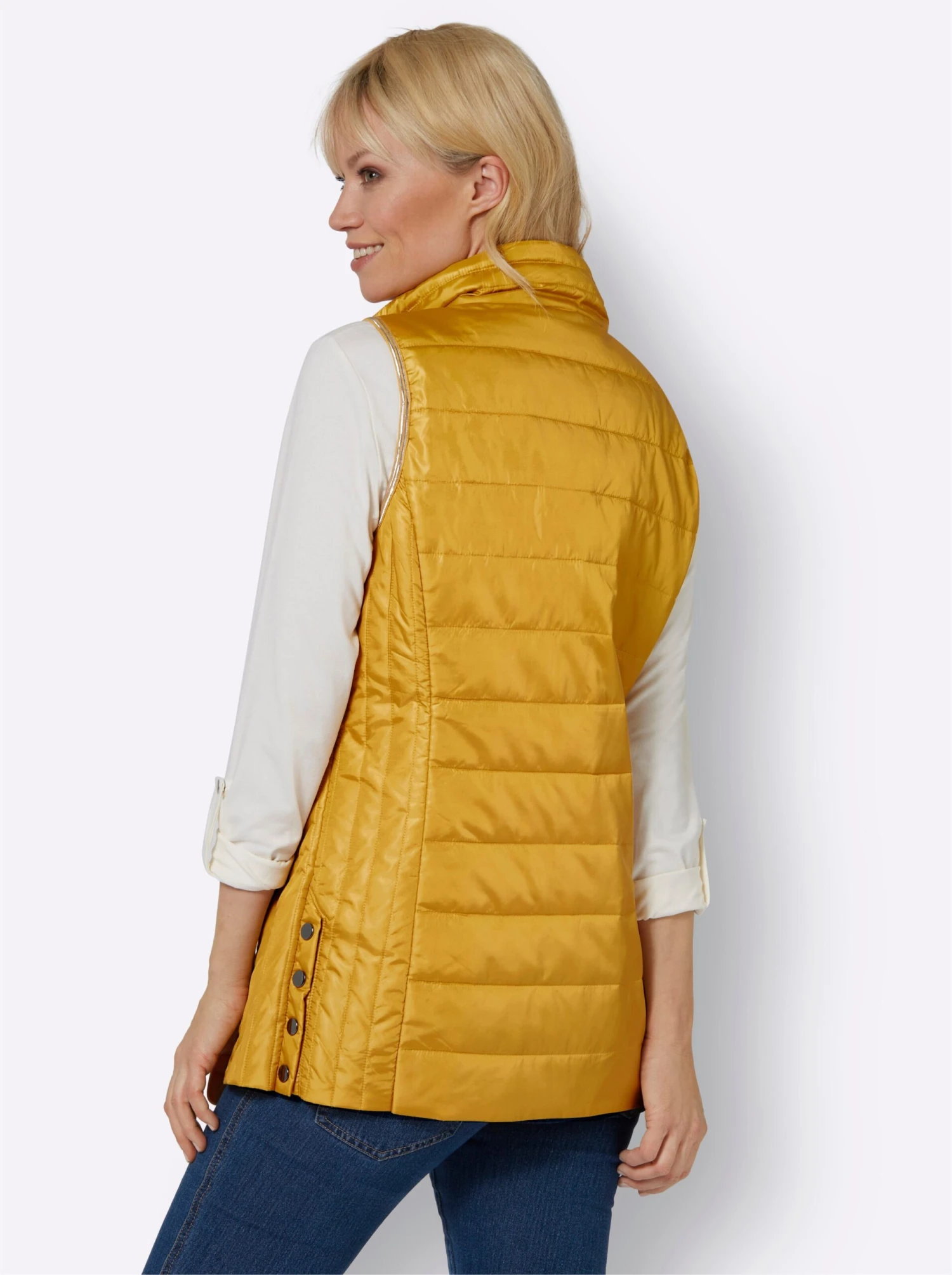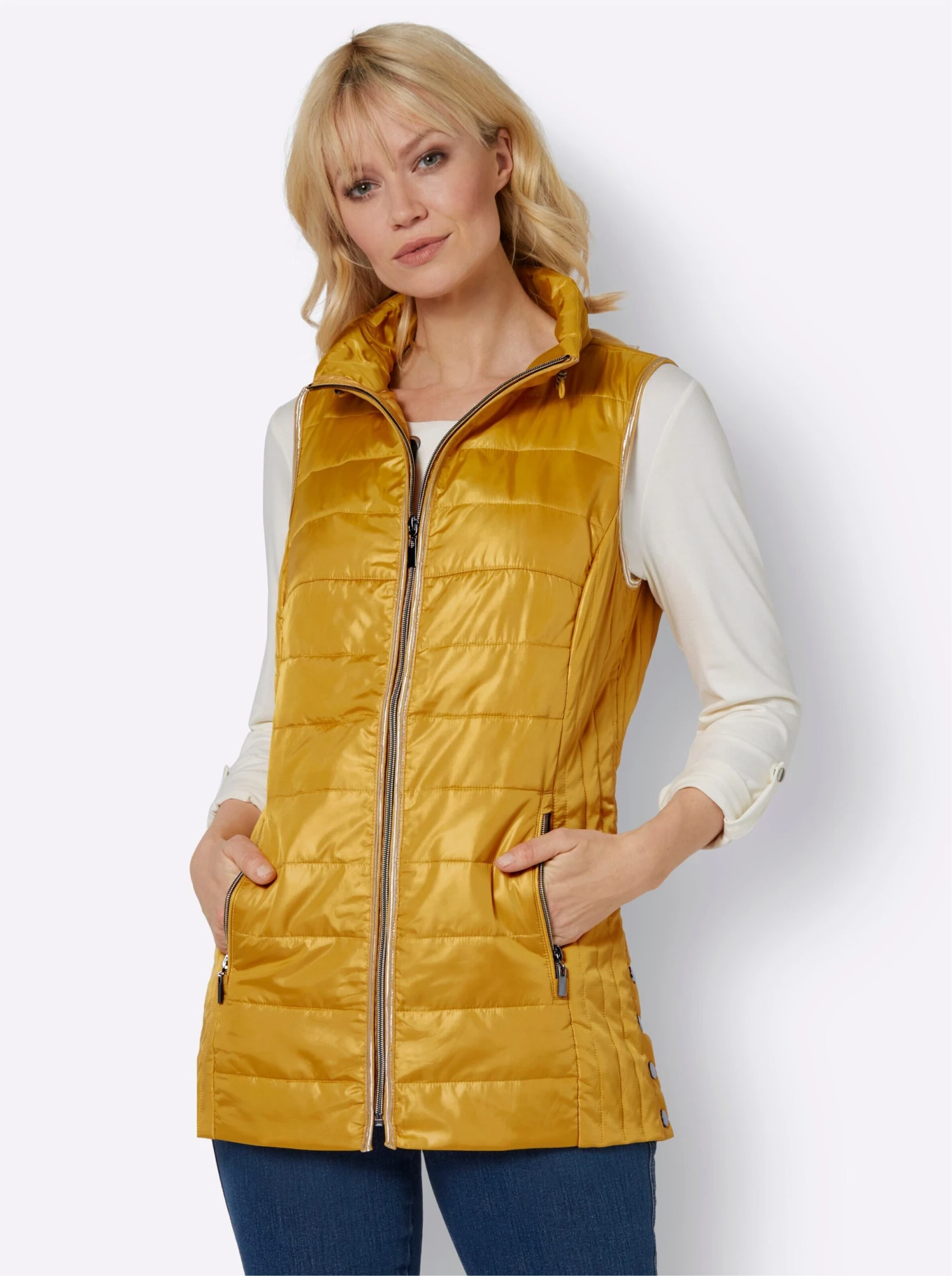 Modischer Begleiter gesucht? Dann wird Ihnen diese wattierte Steppweste gefallen! Mit Stehkragen, durchgehendem Reißverschluss, zwei praktischen Reißverschluss-Taschen und einer Innentasche mit Sicherheitsknopf. Die seitlichen Zier-Knöpfe sorgen für die tolle Optik, die optisch streckende Teilungsnaht für den guten Sitz.