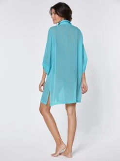 Dezent transparente Strandbluse im lässigen Schnitt. Mit Rundhals-Ausschnitt, Knopfleiste und krempelbaren 3/4-Ärmeln. 2 große Brusttaschen. Lange Seitenschlitze für viel Bewegungsfreiheit.