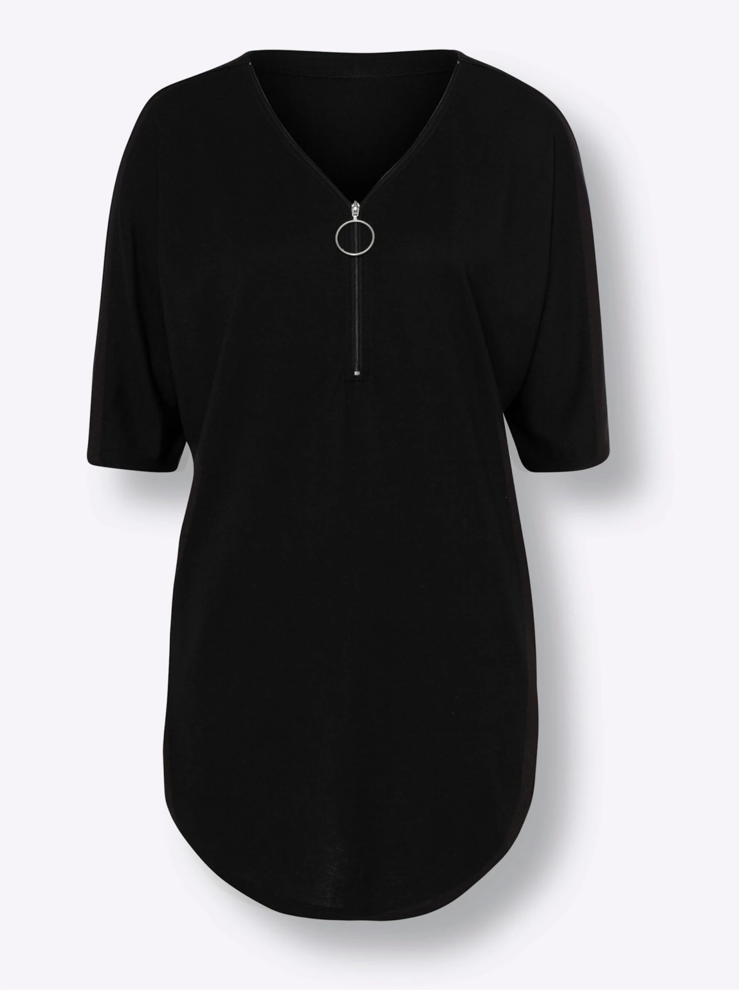 Das Strandshirt gibt es im Leo-Dessin und einfarbig. Mit V-Ausschnitt und Reißverschluss, mit dessen Hilfe Sie die Tiefe Ihres Dekolletés selbst bestimmen können. Schön weit und luftig durch überschnittene Fledermaus-Ärmel. Abgerundeter Saum.