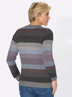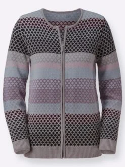 Schön gestaltete Strickjacke im Blockstreifen-Mustermix. Mit Rauten-Jacquard im Vorder- und Rückenteil. Rundhals-Ausschnitt sowie durchgehender Reißverschluss. Gerippte Ärmelabschlüsse mit Fadengummi gearbeitet – so bleiben sie dauerhaft elastisch! Herrlich weiche, pflegeleichte Qualität.
