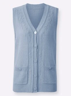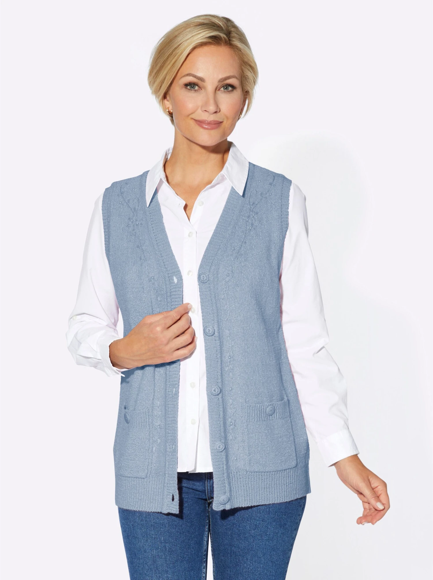 Wunderbar weiche Strickweste mit aufwändiger Stickerei und Zierperlen entlang des V-Ausschnitts und der Knopfleiste. Aufgesetzte Taschen mit Knopf. Gerippte Abschlüsse. Sorgfältig in Form gestrickt. Bouclé-Optik. Pflegeleicht.