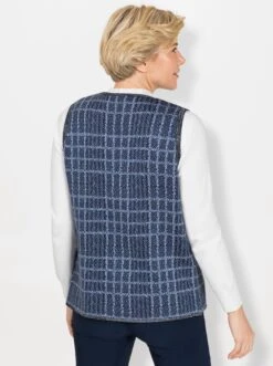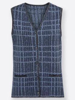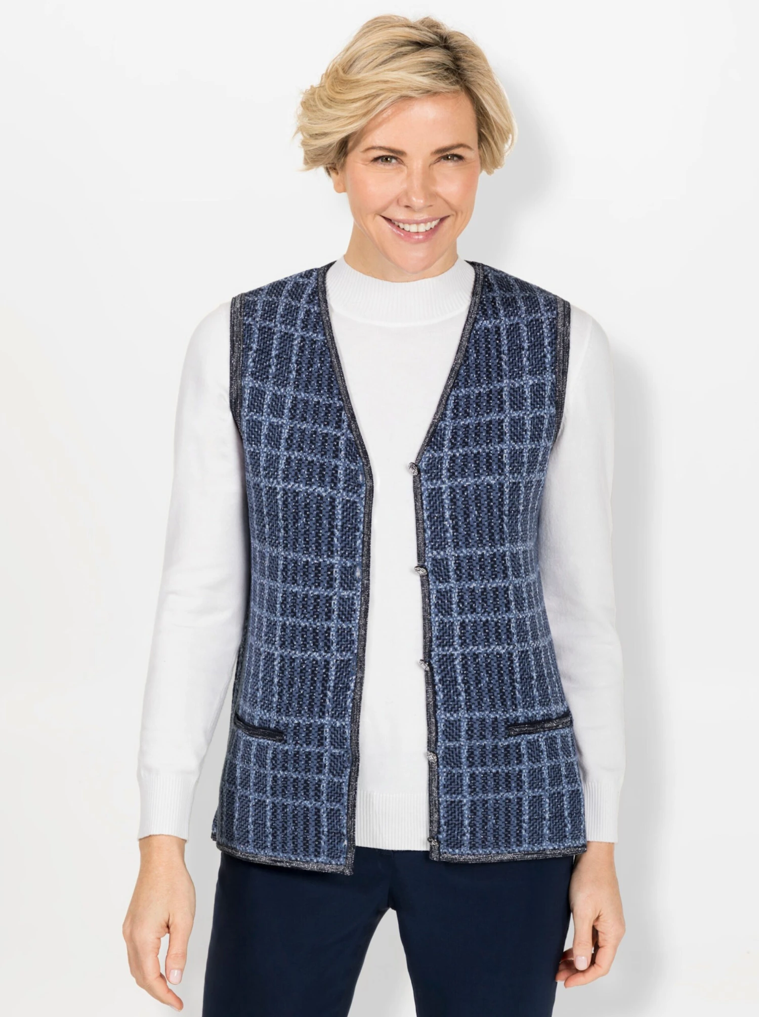 Im hochwertigen Material-Mix mit Merino-Wolle: Strickweste im aufwändigen Jacquard-Karo mit effektvollem Glanzgarn. Streckender V-Ausschnitt. Praktische eingearbeitete Taschen.