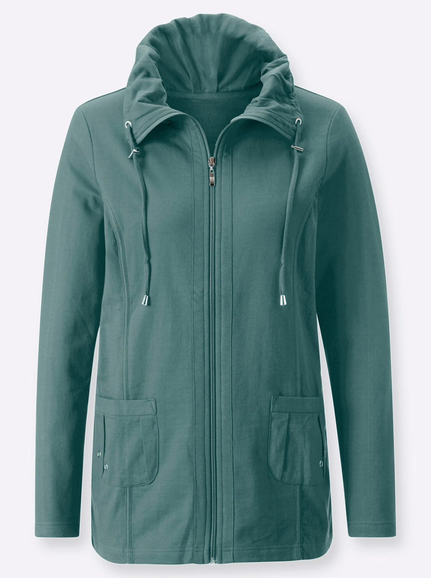 Tolle Sweatjacke mit dekorativer Faltenpartie am Umlegekragen mit Tunnelzug und Stoppern. Durchgehender Reißverschluss. 2 aufgesetzte Taschen aus Single-Jersey mit Falten und Ziernieten. Unterstützt die Initiative Cotton made in Africa.