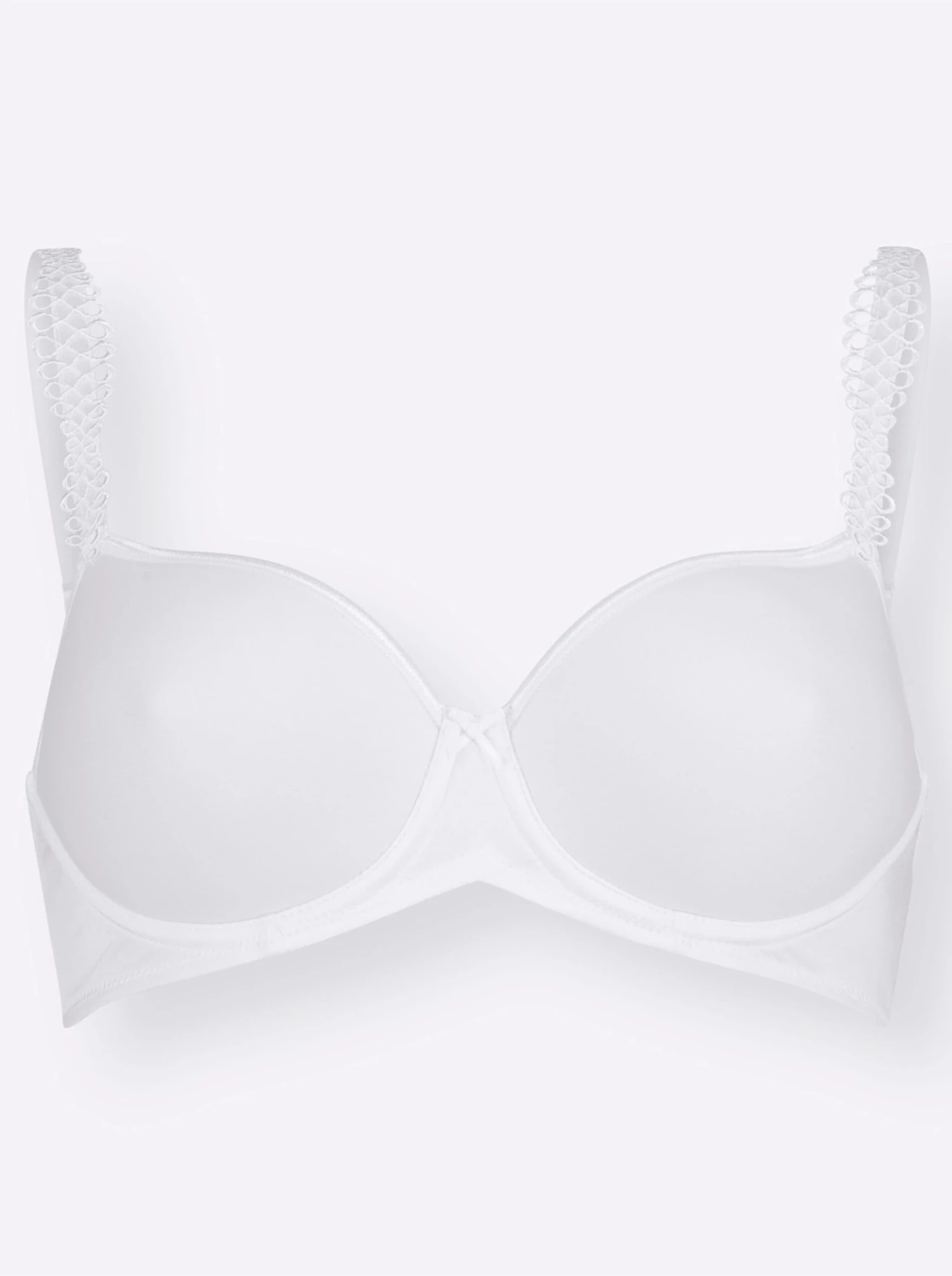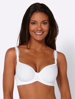 Hält was er verspricht – auch in großen Größen: T-Shirt-BH mit Bügel von Viania. Die attraktiven, mit einer Spitzen-Applikation verzierten Träger dürfen gerne unter dem Oberteil hervorblitzen. Mit funkelndem Glitzersteinchen zwischen den gemoldeten Cups. Dank dem atmungsaktiven, weichen Spacer-Material ist er sehr trageangenehm. Ohne störende Nähte – so zeichnet sich unter enganliegender Kleidung nichts ab.