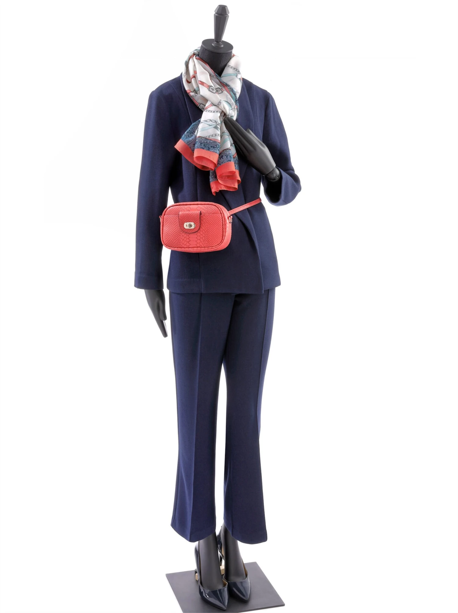 Zwei die perfekt zusammenpassen! Modisches, 2-tlg. Accessoire-Set aus Tasche und Schal. Der Clou: Die Handtasche mit verstellbarem Tragegurt können Sie auch als Bauchtasche um die Hüfte tragen. Bauchgurt mit Klick-Verschluss. Hauptfach mit Reißverschluss und Steckfach vorne. Maße ca. 19x14x6 cm. Farblich abgestimmter Schal im Kettendessin. 100% Polyester. Maße ca. 16×180 cm.