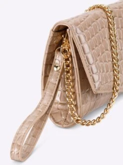 Schicker Begleiter: Tasche mit abnehmbarem Umhängegurt und ebenfalls abnehmbarer Handschlaufe. So kann sie als Clutch oder Umhängetasche getragen werden. Maße ca. 24,5x6x14 cm. Aus Leder-Imitat.