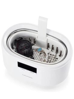 Ultraschall-Reiniger zur intensiven Reinigung von Zahnprothesen, Schmuck, Brillen, etc. Mit Siebeinsatz für Kleinteile. Großer Edelstahl-Tank mit 500 ml Fassungsvermögen. 5-Minuten-Abschaltautomatik und LED-Display mit Timer. 220-240V/50W. 3 Jahre Garantie. Maße ca. 24x18x17 cm.
