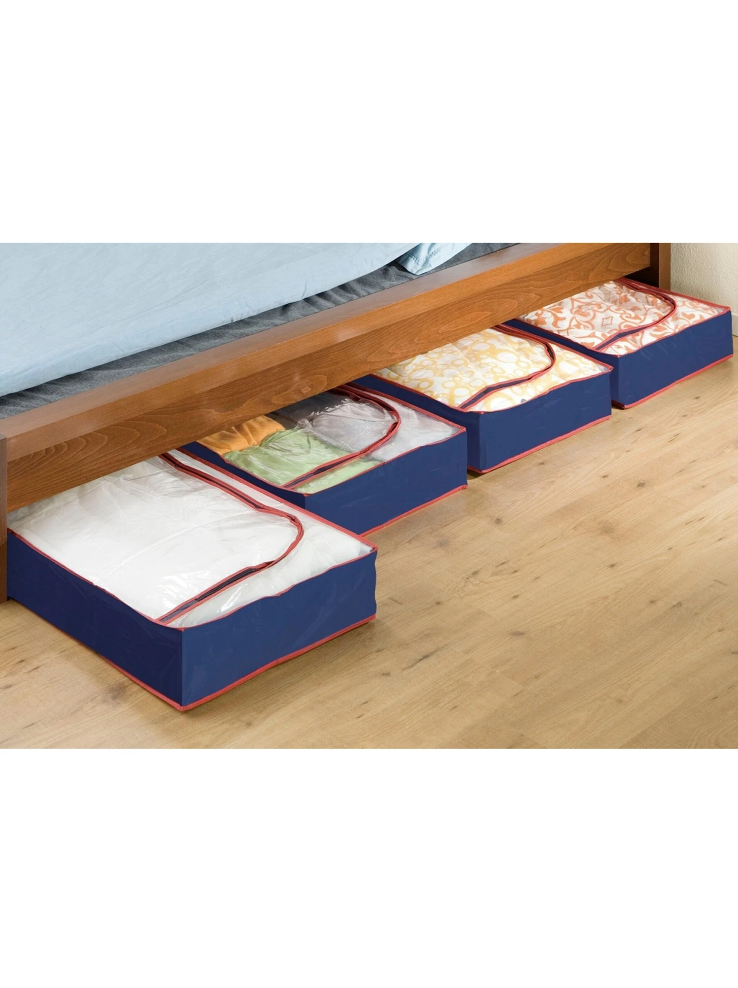 Für mehr Ordnung und Platz, nutzen Sie doch den Stauraum unter Ihrem Bett oder auf Ihrem Kleiderschrank! Diese 4-teiligen Unterbett-Kommoden bewahren zuverlässig und ordentlich verpackt Ihre nicht benötigten Schuhe, Kleidungsstücke etc. auf. Das integrierte Sichtfenster ermöglicht Ihnen jederzeit einen Blick auf den Inhalt. Mit 3-seitigem Reißverschluss. Platzsparend zusammenleg- und abwaschbar. Maße ca. 100x15x45 cm.