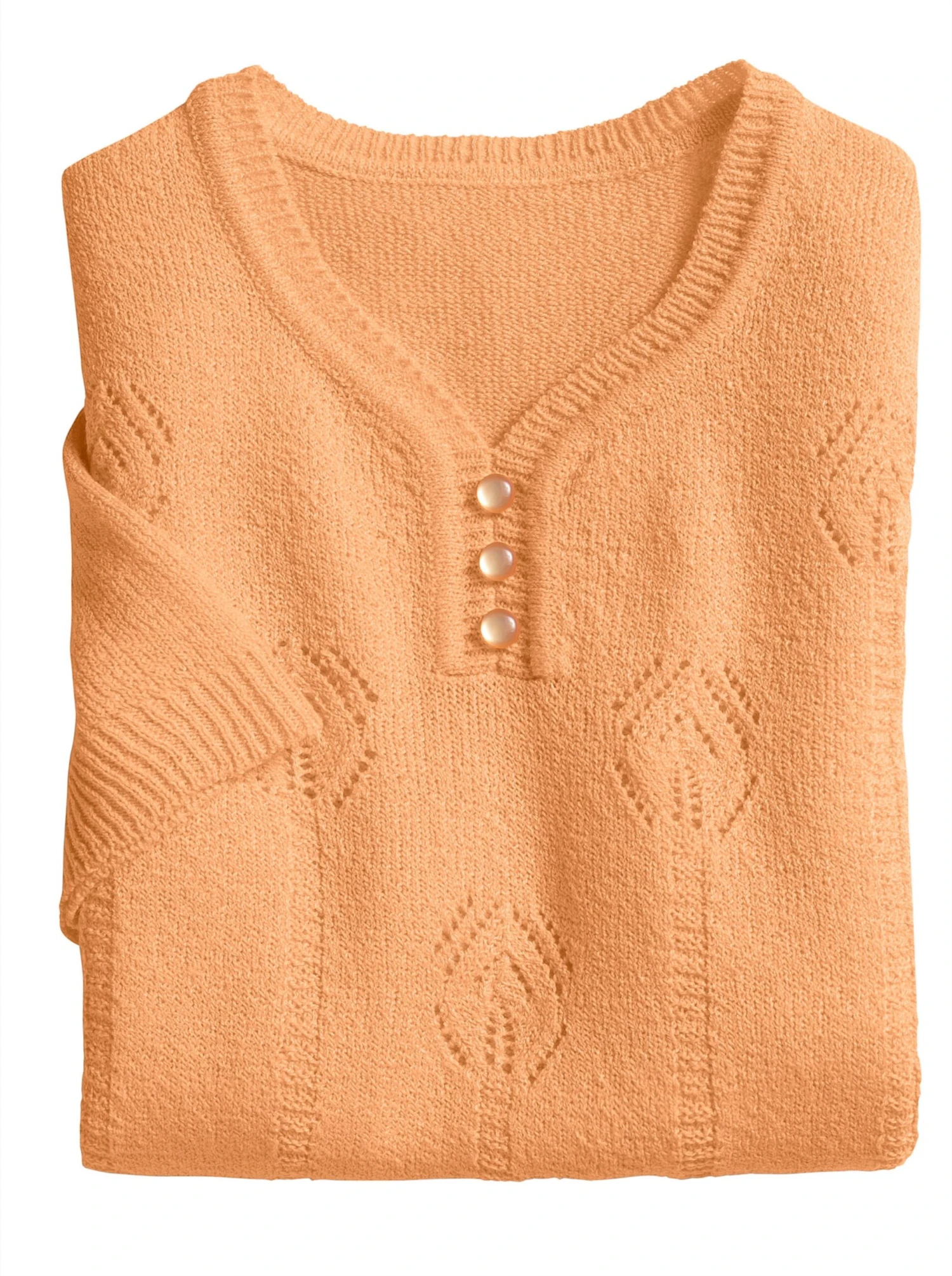 In angenehm weicher Bouclé-Qualität: Pullover mit Ajourmuster im Vorderteil. V-Ausschnitt mit 3 Zierknöpfen, Rippabschlüsse. Aufwändig passformgerecht in Form gestrickt.