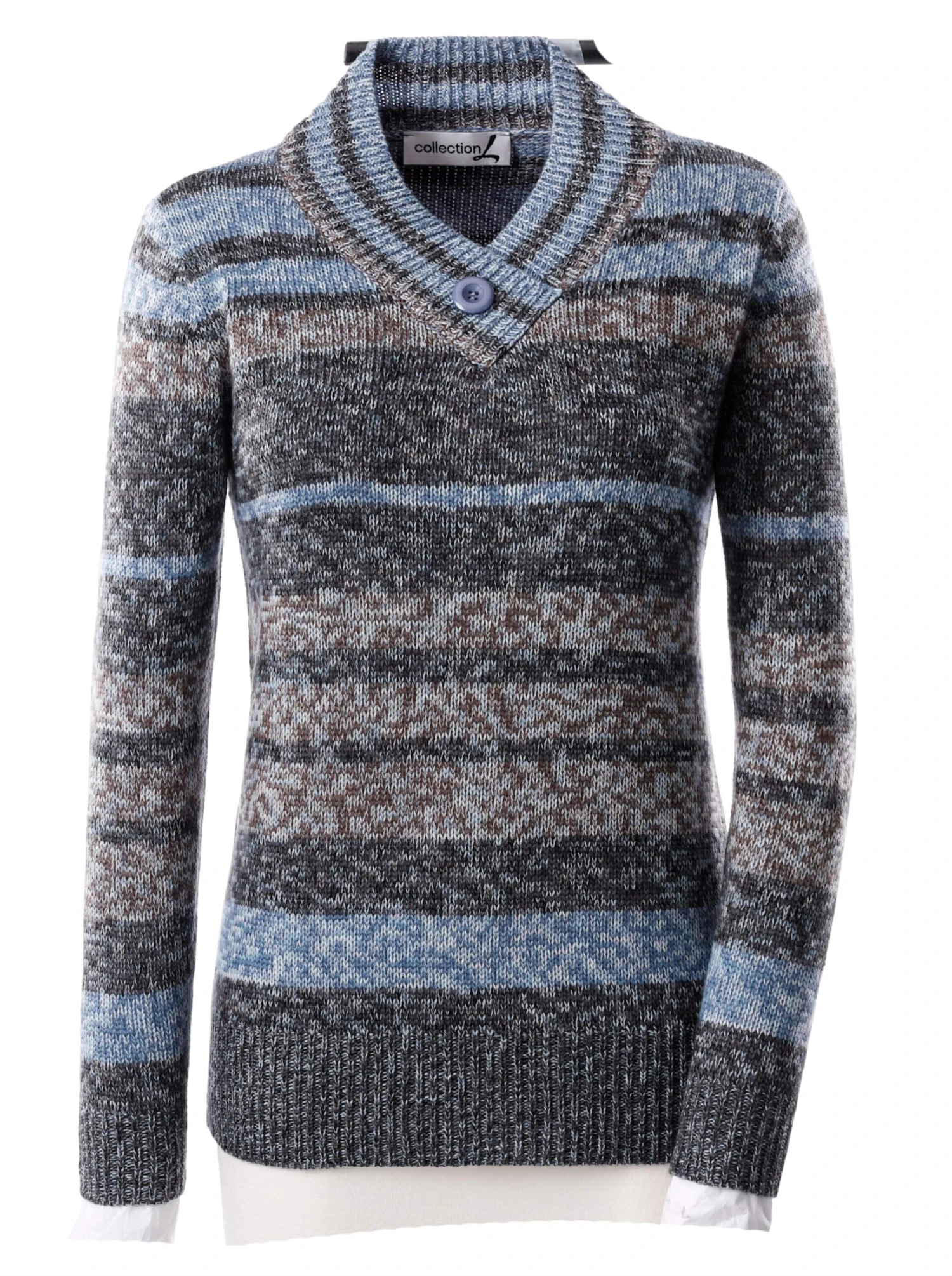 Flott geringelter Pullover aus weichem Melangegarn. Überlappender V-Ausschnitt mit Zierknopf und gerippte Abschlüsse. Aufwändig passgenau gestrickt.